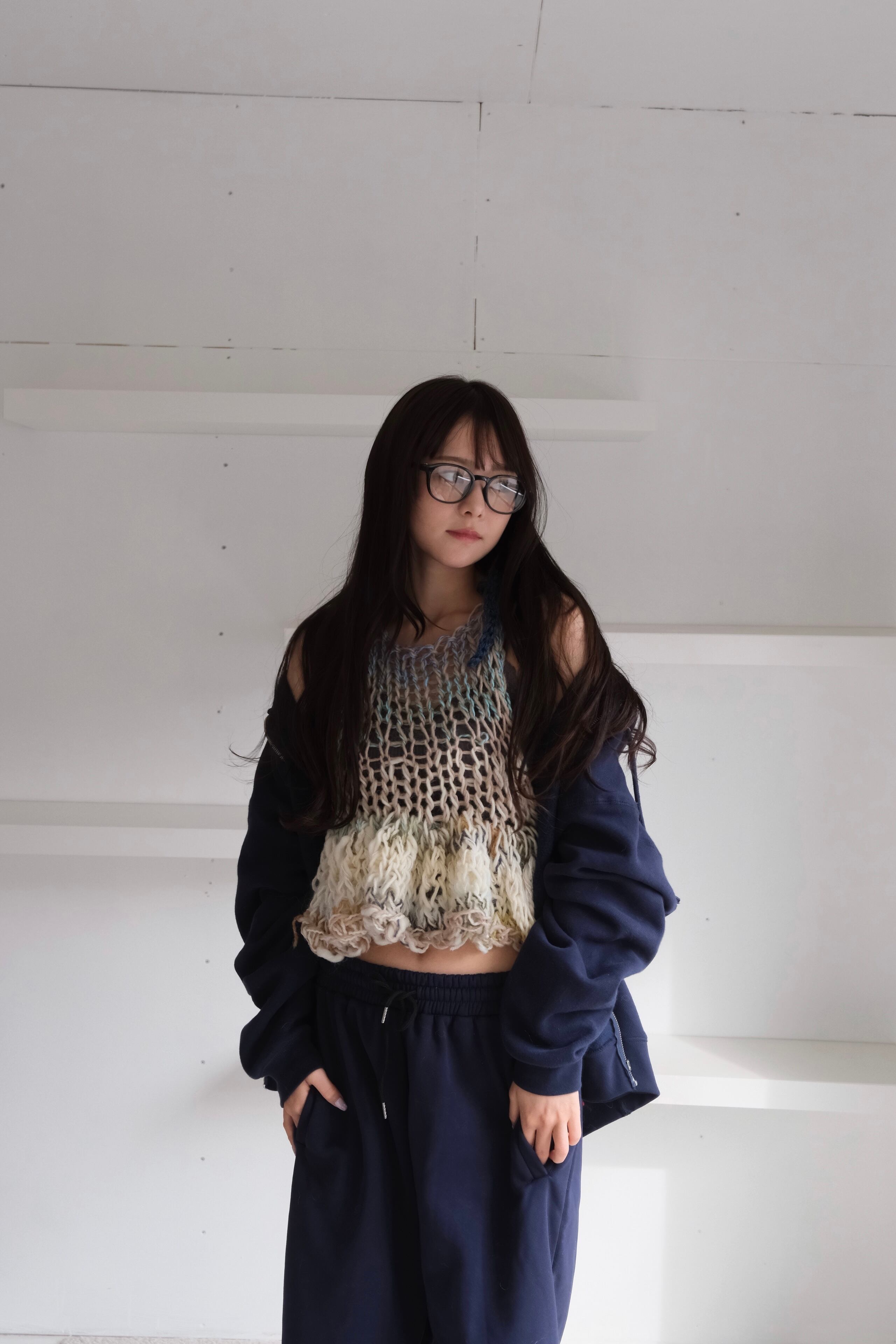 •糸を引き揃えて制作しており、商品によっては糸端が表に出ることがありますが製法上の特性ですので商品不良での返品対象になりません。気になるようでしたら裏から引っ張ってしまうか、表に出ている部分を切ってください。特にミックス毛糸でシースルーに仕上げている商品では、仕上げの際に糸端の処理をしていても着用中に糸端が表にでることがあります。質感の一部としてお楽しみ頂ける方のみご購入ください。