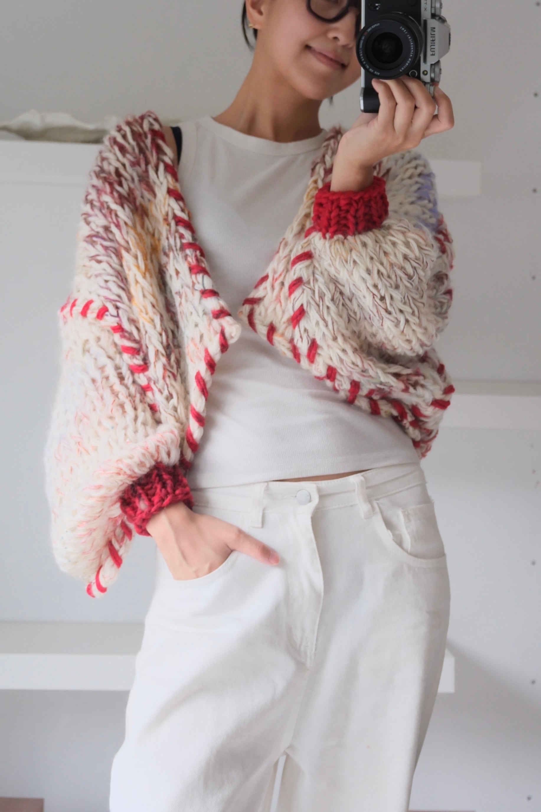 – Since we repurpose second hand yarn, we are not able to provide exact information about the materials. Please note that because of this, some dry cleaning stores may reject taking in knitwear you have purchased from amuamu.