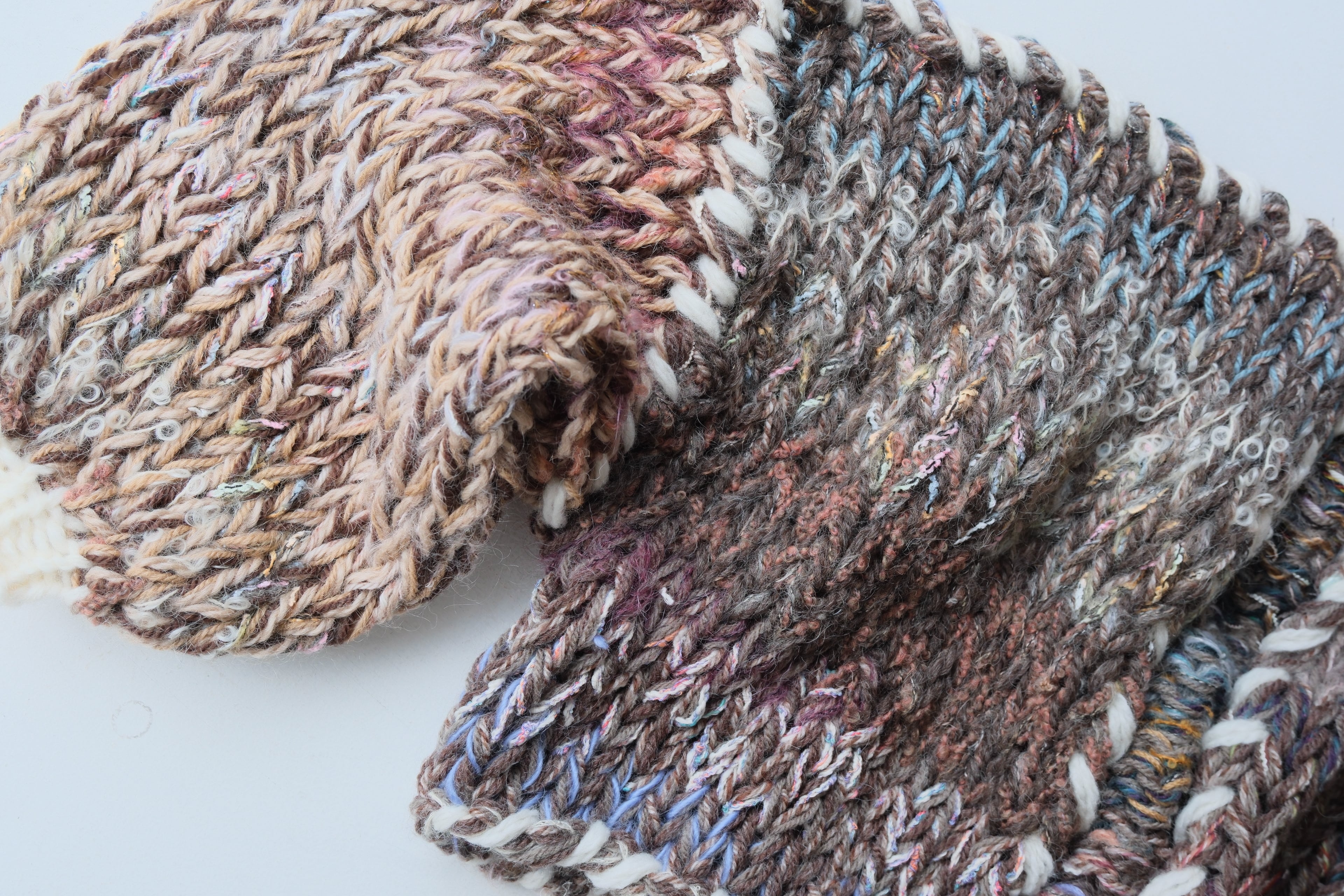 •セカンドハンドの毛糸を混ぜて使用しているため正確な品質表示が出せませんが、主に60~100%モヘア/ウール、その他アンゴラ、綿、シルク、アクリル、ポリエステルなどです。