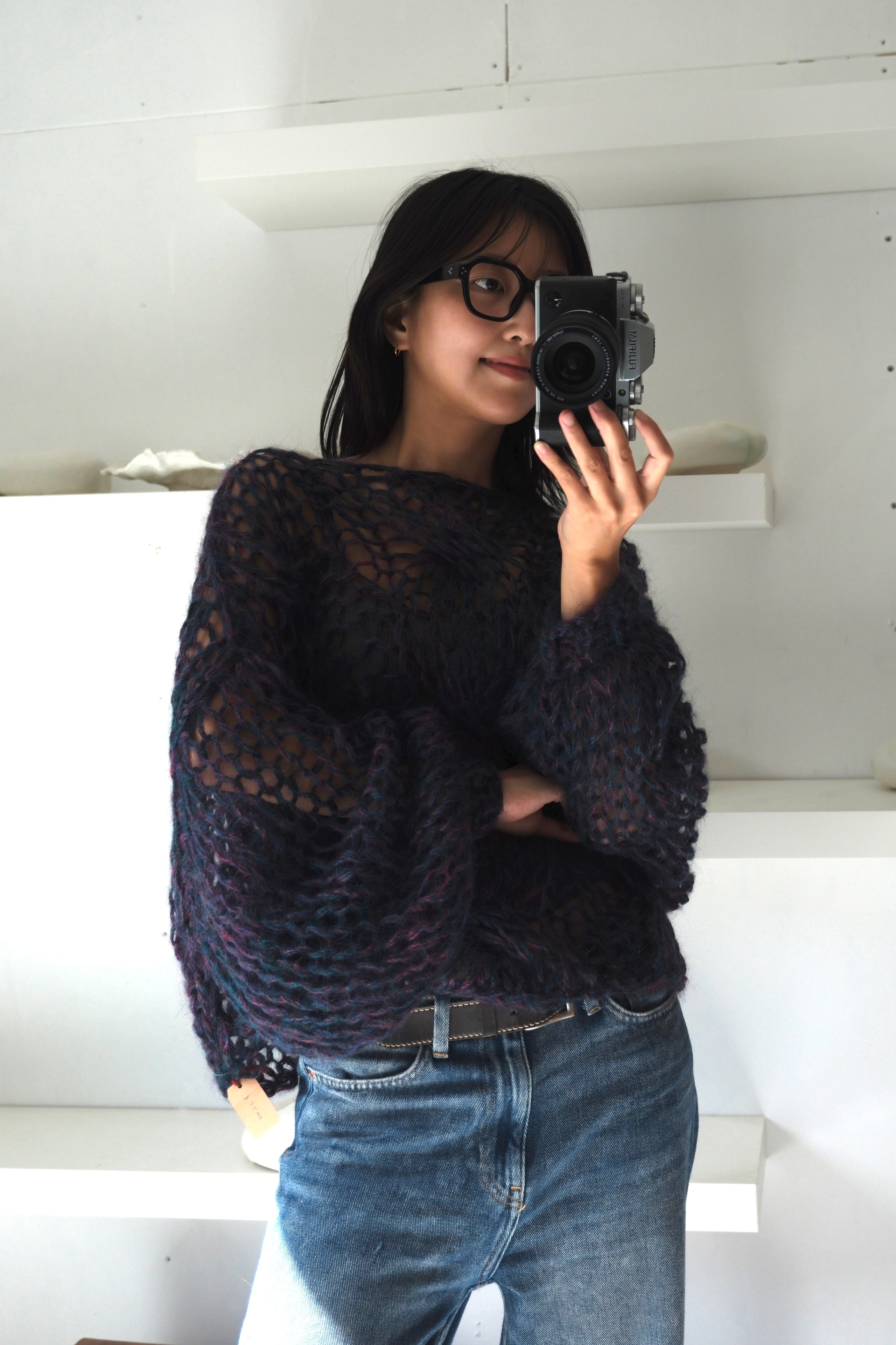 An airy, cosy layer of comfort that hugs your skin — every single piece is uniquely handknitted, using plenty of high quality second hand wool and mohair yarns.