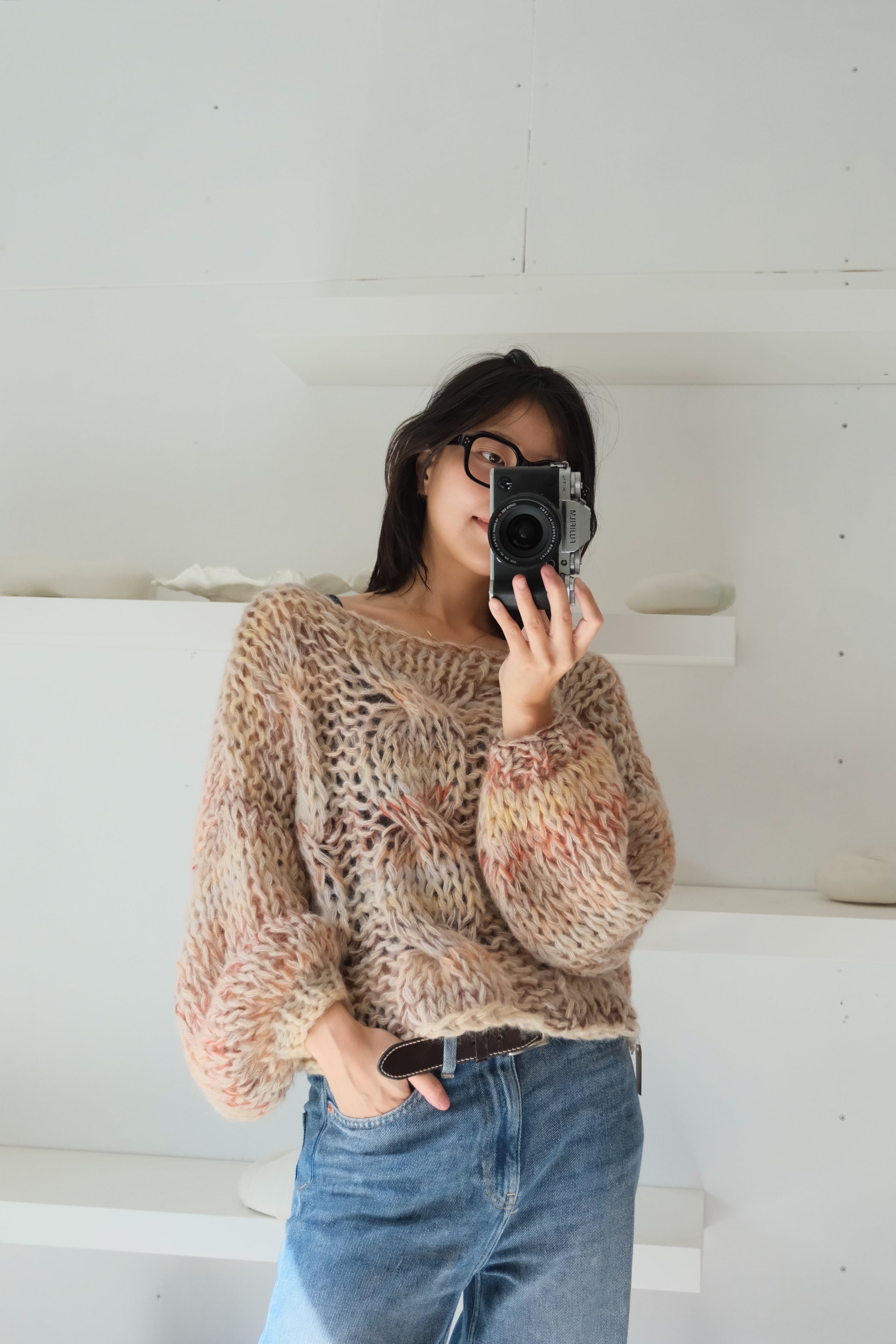 An airy, cosy layer of comfort that hugs your skin — every single piece is uniquely handknitted, using plenty of high quality second hand wool and mohair yarns.