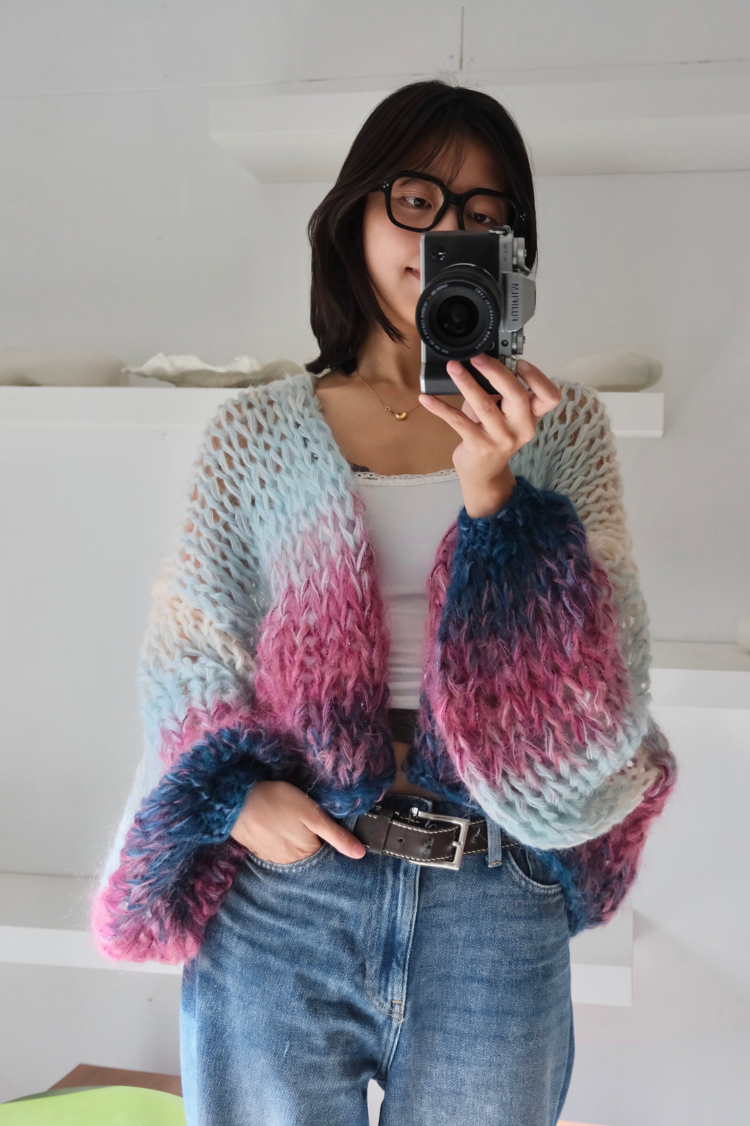 An airy, cosy layer of comfort that hugs your skin — every single piece is uniquely handknitted, using plenty of high quality second hand wool and mohair yarns.