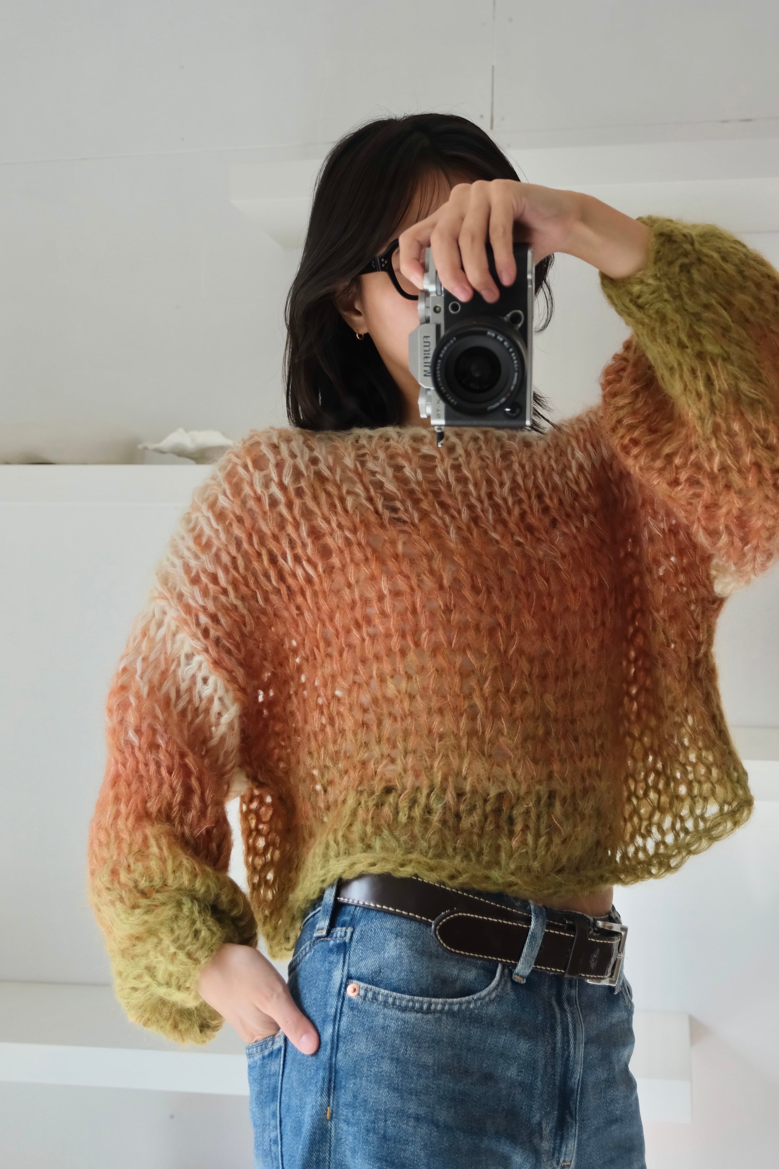 An airy, cosy layer of comfort that hugs your skin — every single piece is uniquely handknitted, using plenty of high quality second hand wool and mohair yarns.
