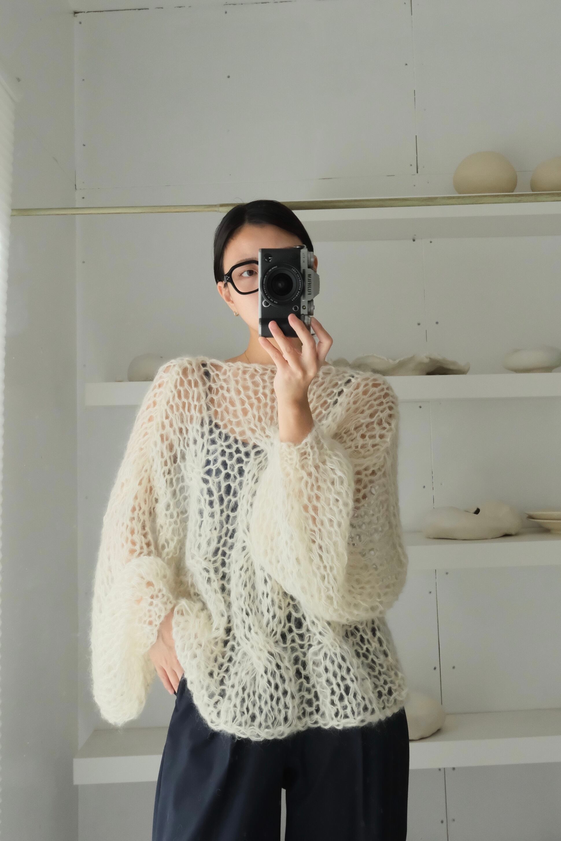 特にミックス毛糸でシースルーに仕上げている商品では、仕上げの際に糸端の処理をしていても着用中に糸端が表にでることがあります。質感の一部としてお楽しみ頂ける方のみご購入ください。
