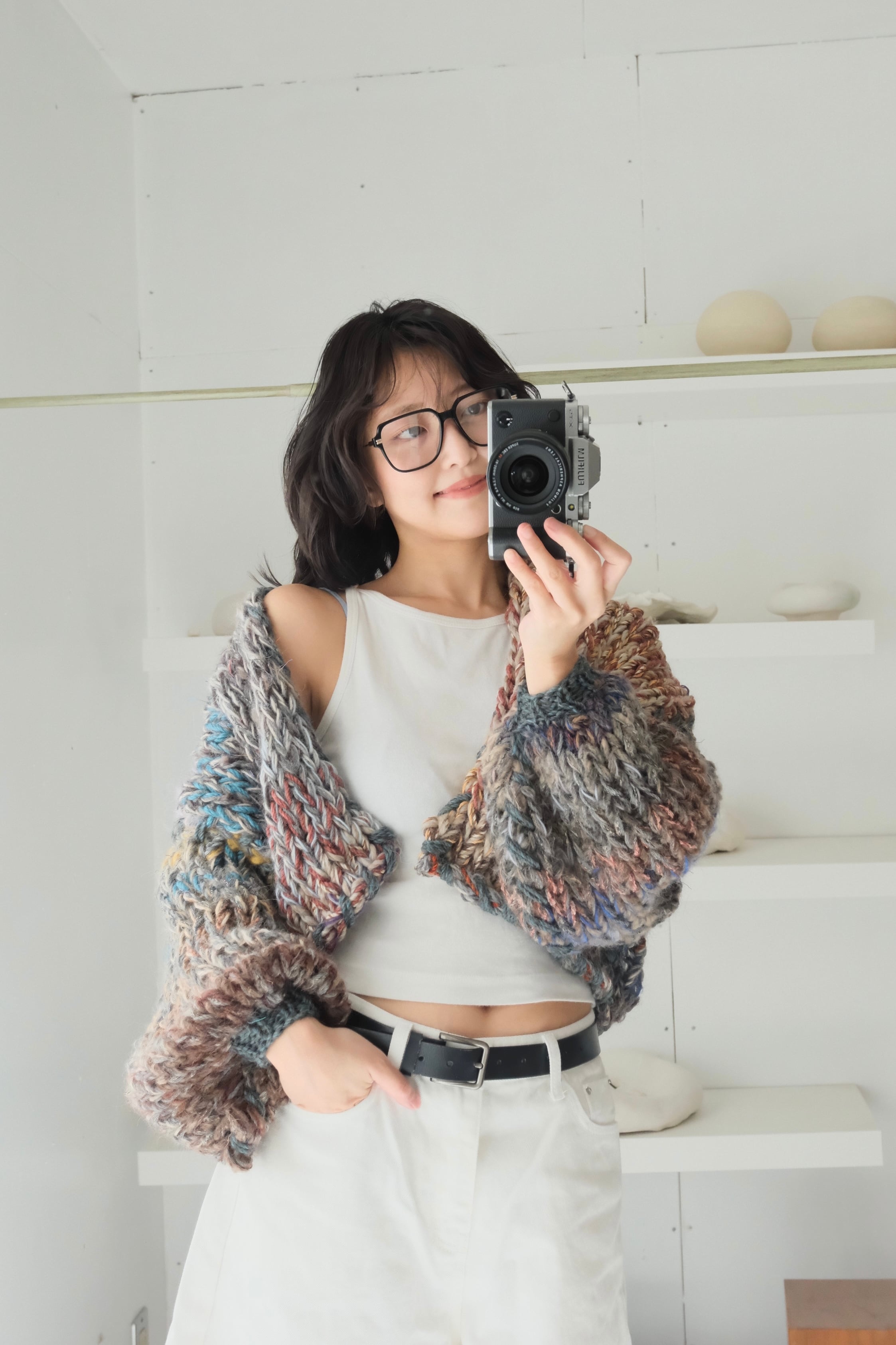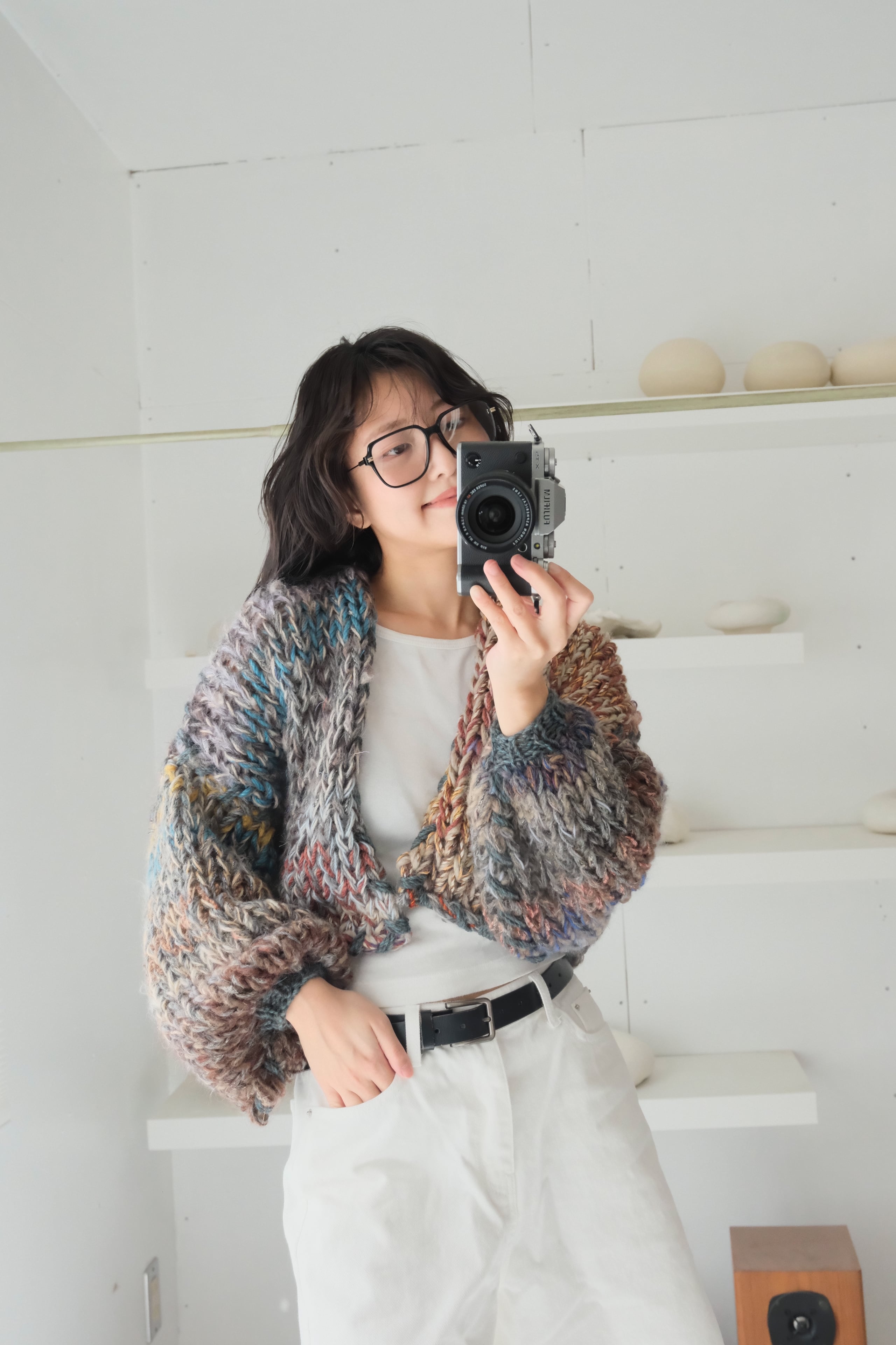 数十種類の毛糸をミックスして編んだカーディガン。肉厚で暖かく、春秋はアウターとして着用できます。