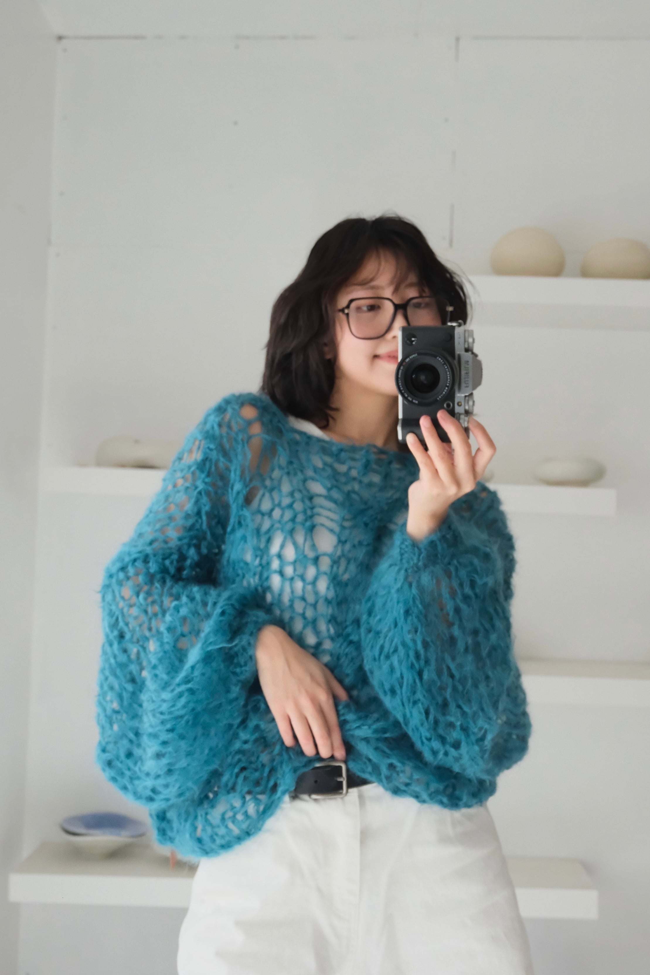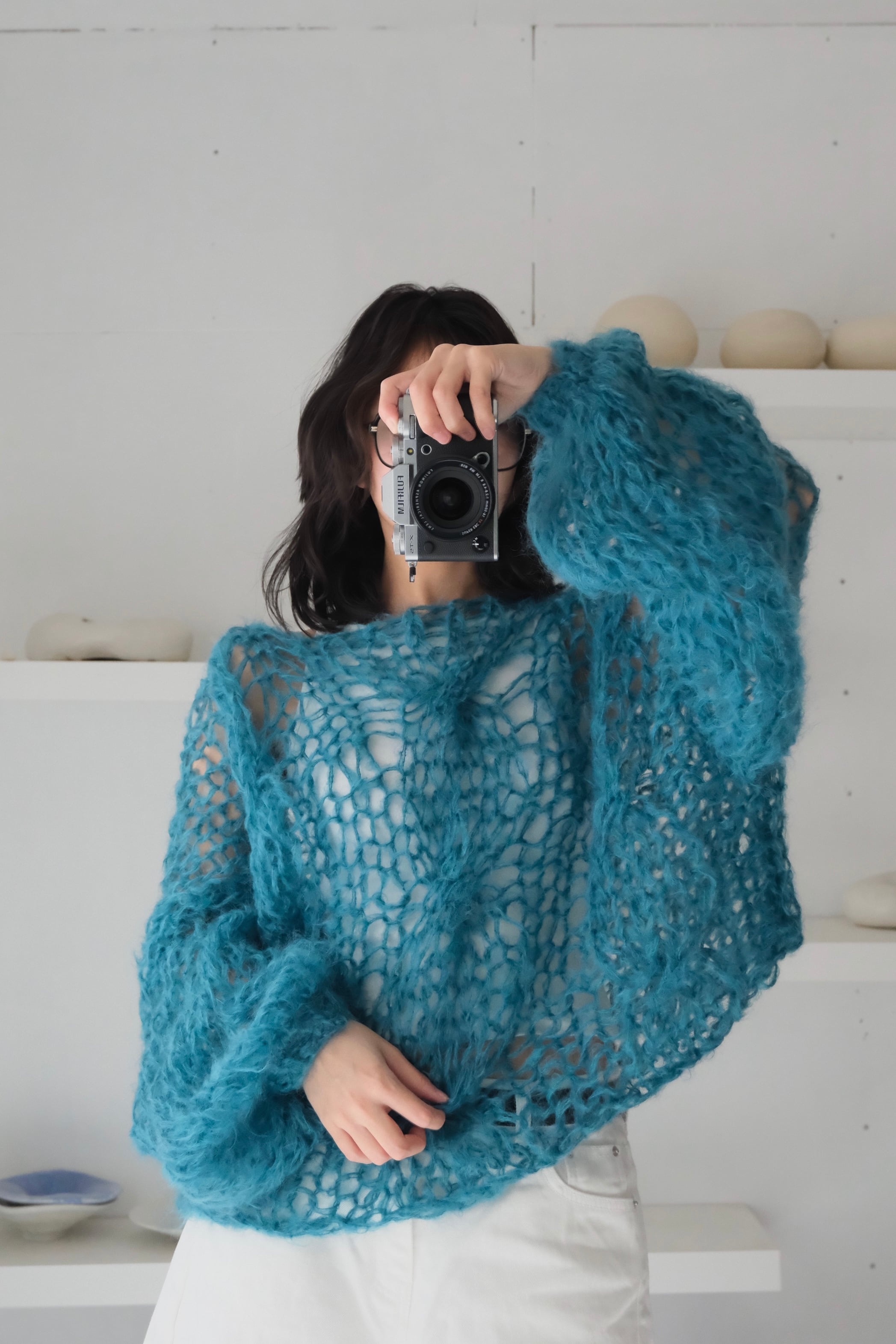 An airy, cosy layer of comfort that hugs your skin — every single piece is uniquely handknitted, using plenty of high quality second hand wool and mohair yarns.