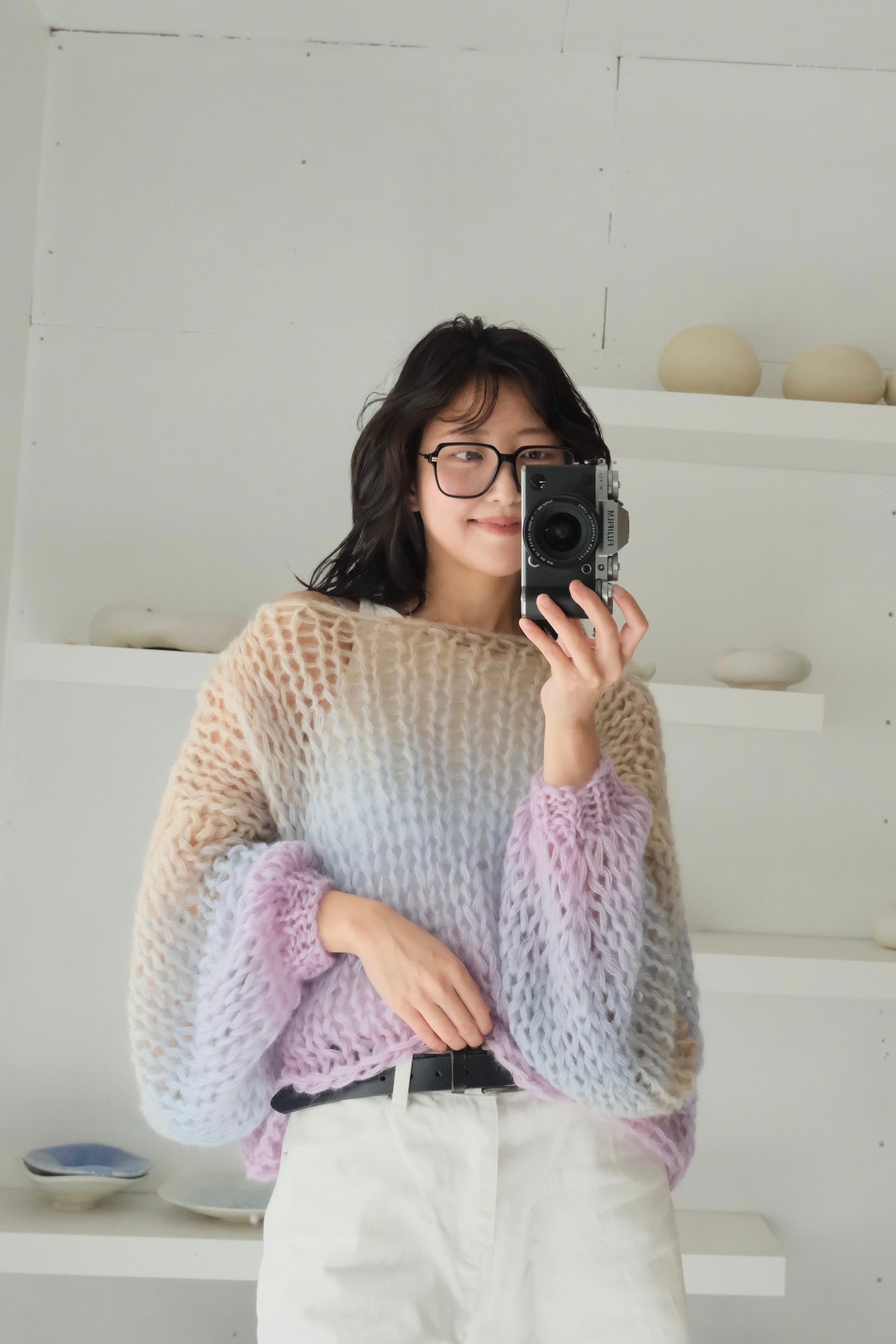 An airy, cosy layer of comfort that hugs your skin — every single piece is uniquely handknitted, using plenty of high quality second hand wool and mohair yarns.