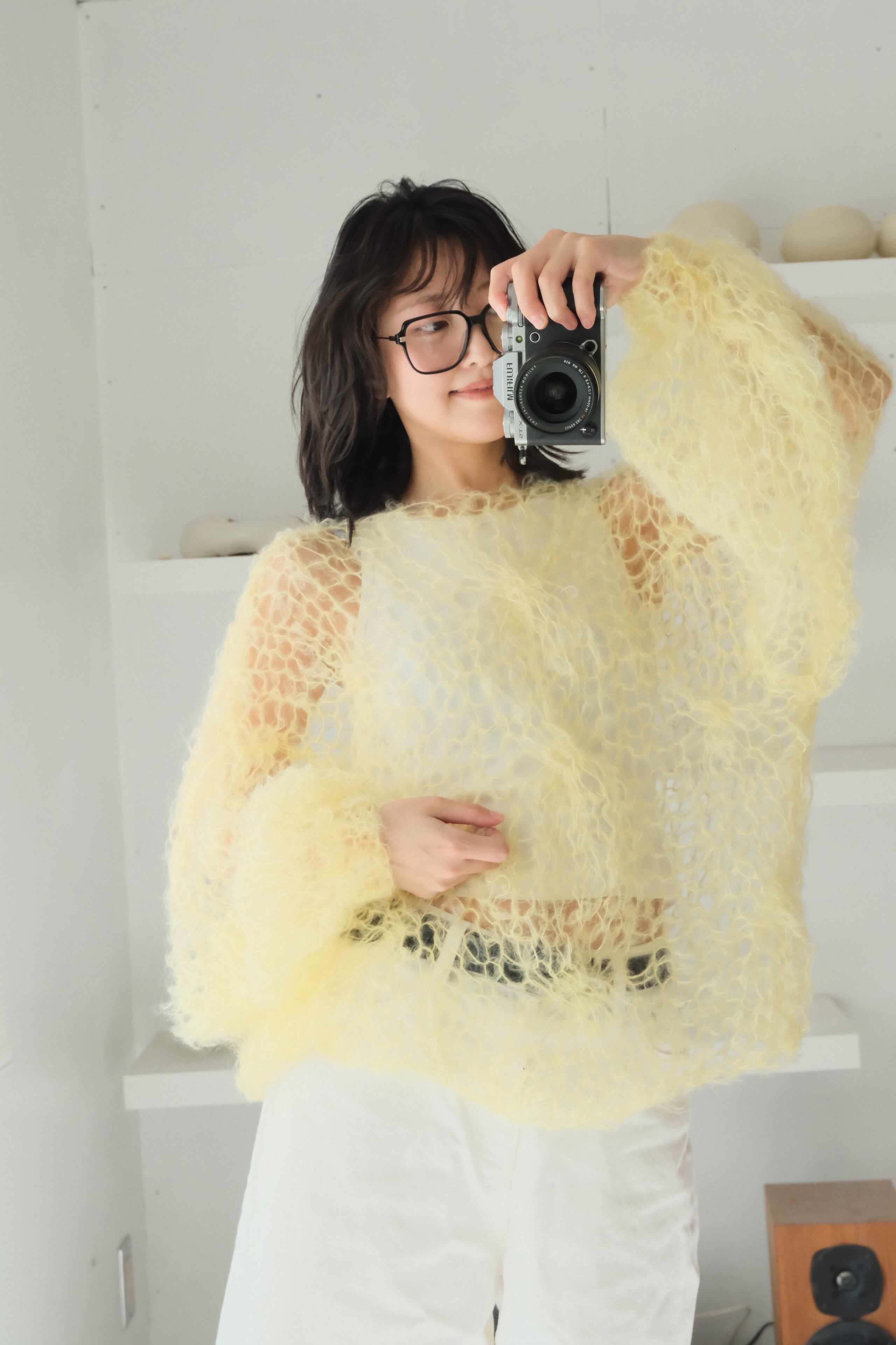 上質で柔らかなモヘアをシースルーに編み上げています。インナーと合わせれば真冬もモヘアのあたたかさを楽しめます。