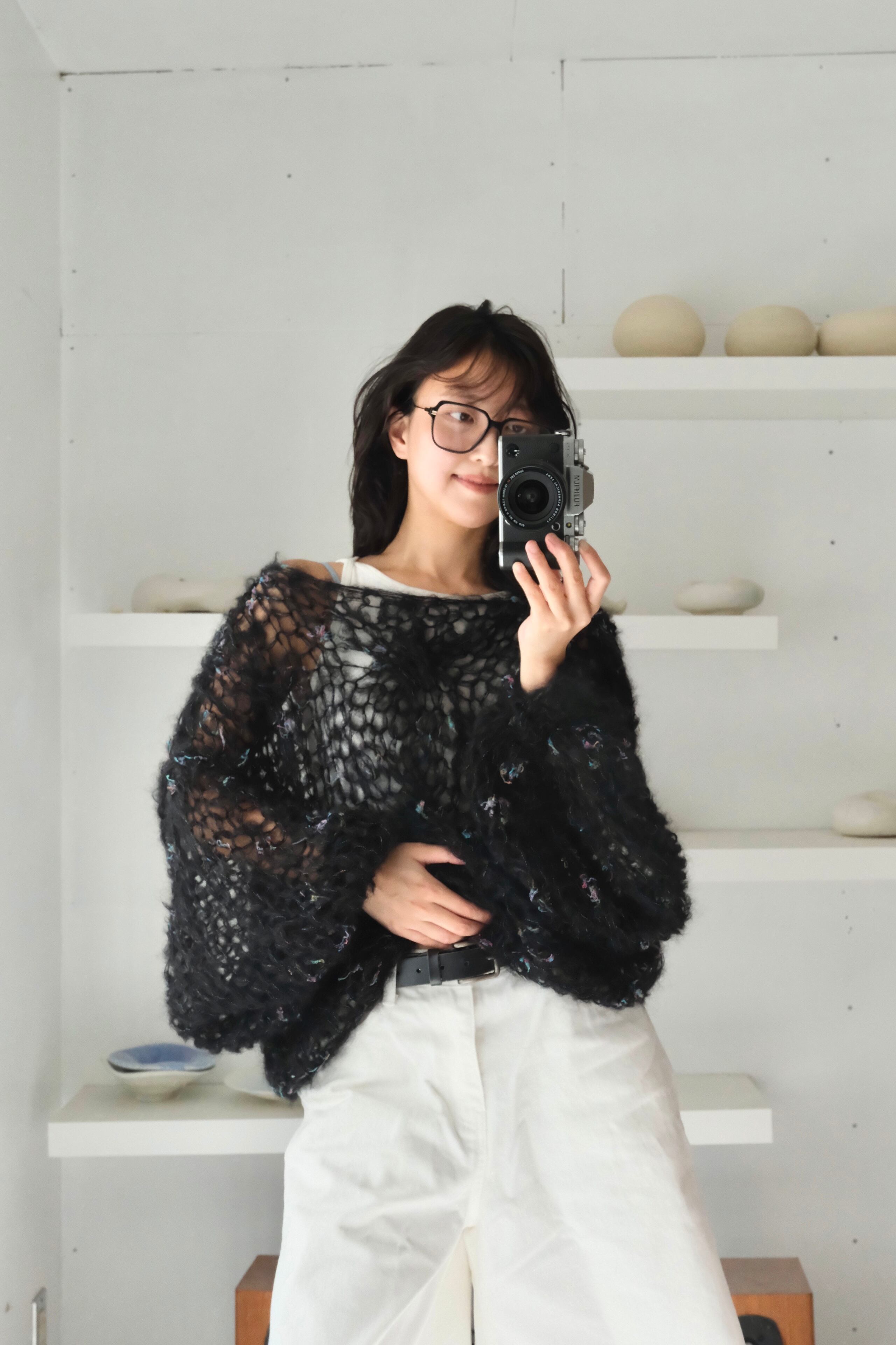 特にミックス毛糸でシースルーに仕上げている商品では、仕上げの際に糸端の処理をしていても着用中に糸端が表にでることがあります。質感の一部としてお楽しみ頂ける方のみご購入ください。