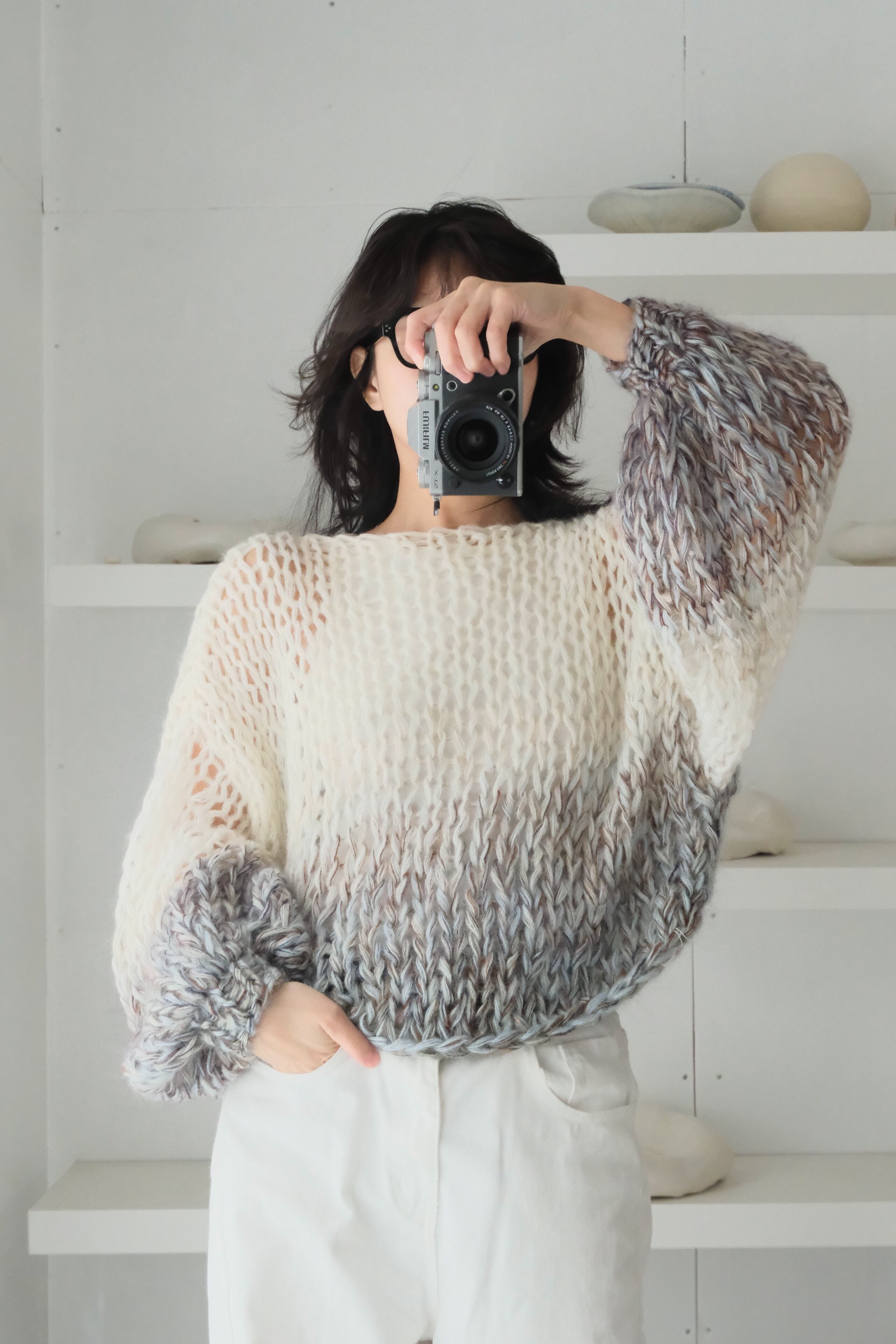 特にミックス毛糸でシースルーに仕上げている商品では、仕上げの際に糸端の処理をしていても着用中に糸端が表にでることがあります。質感の一部としてお楽しみ頂ける方のみご購入ください。