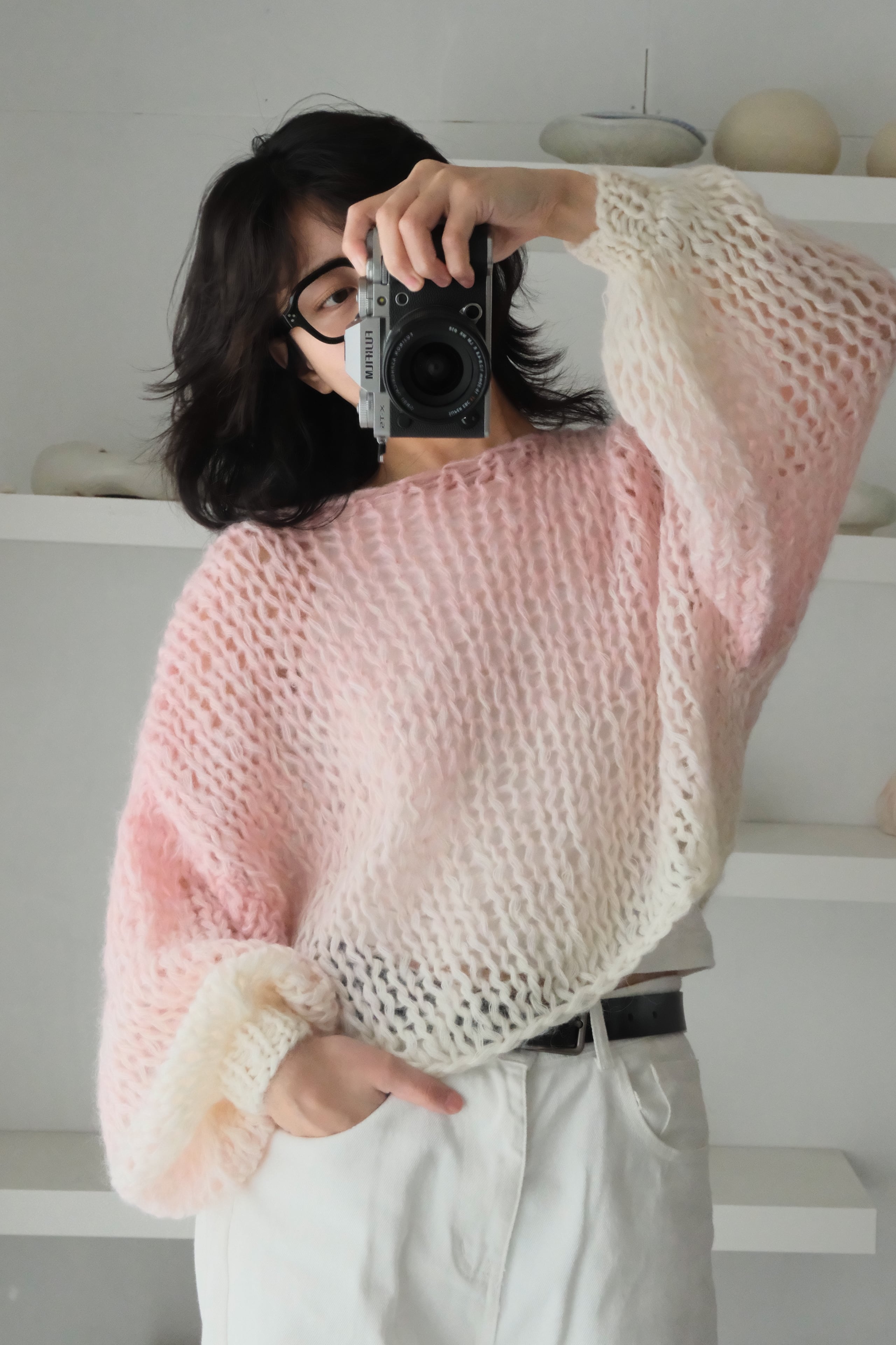 An airy, cosy layer of comfort that hugs your skin — every single piece is uniquely handknitted, using plenty of high quality second hand wool and mohair yarns.