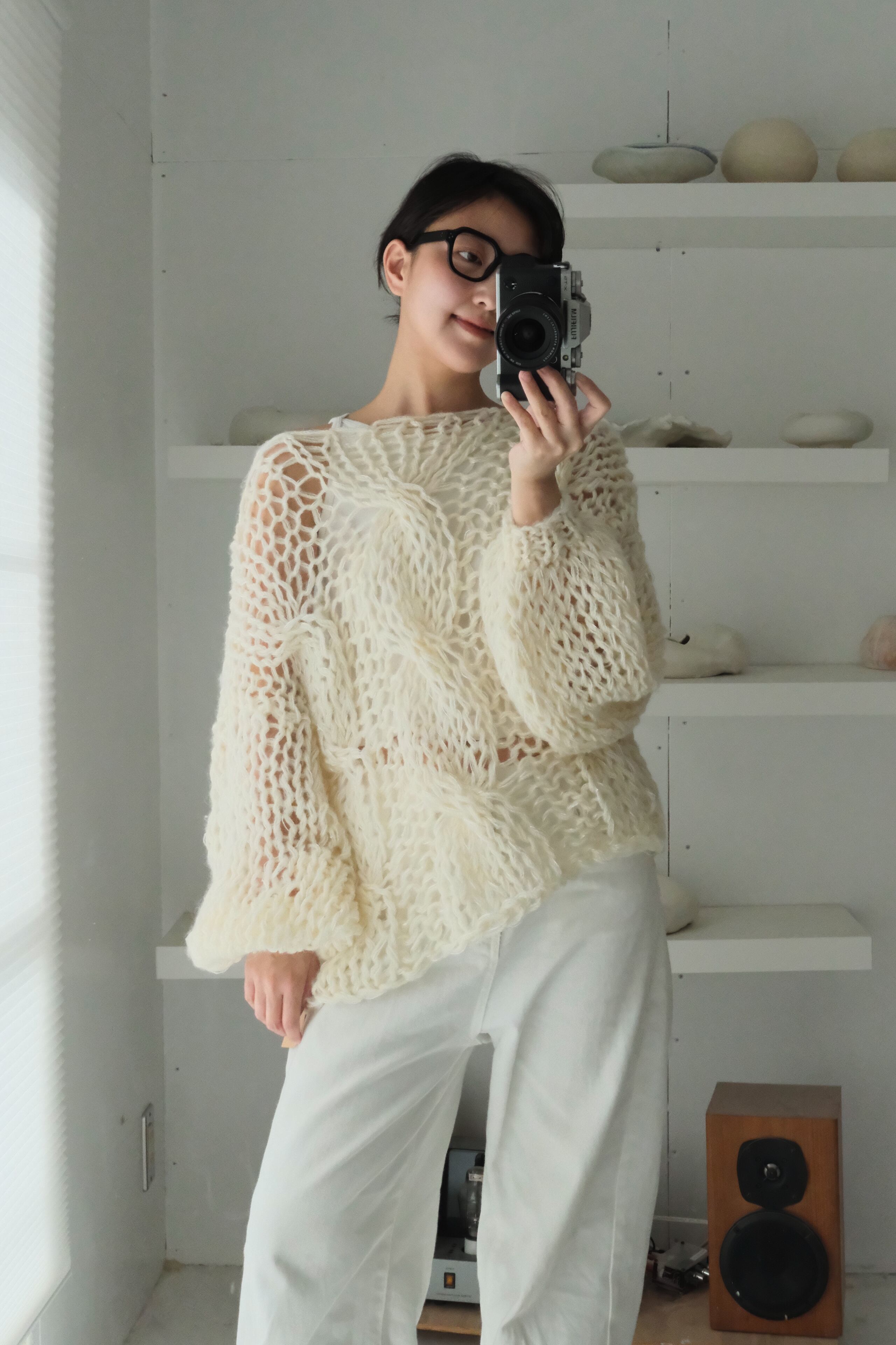 An airy, cosy layer of comfort that hugs your skin — every single piece is uniquely handknitted, using plenty of high quality second hand wool and mohair yarns.