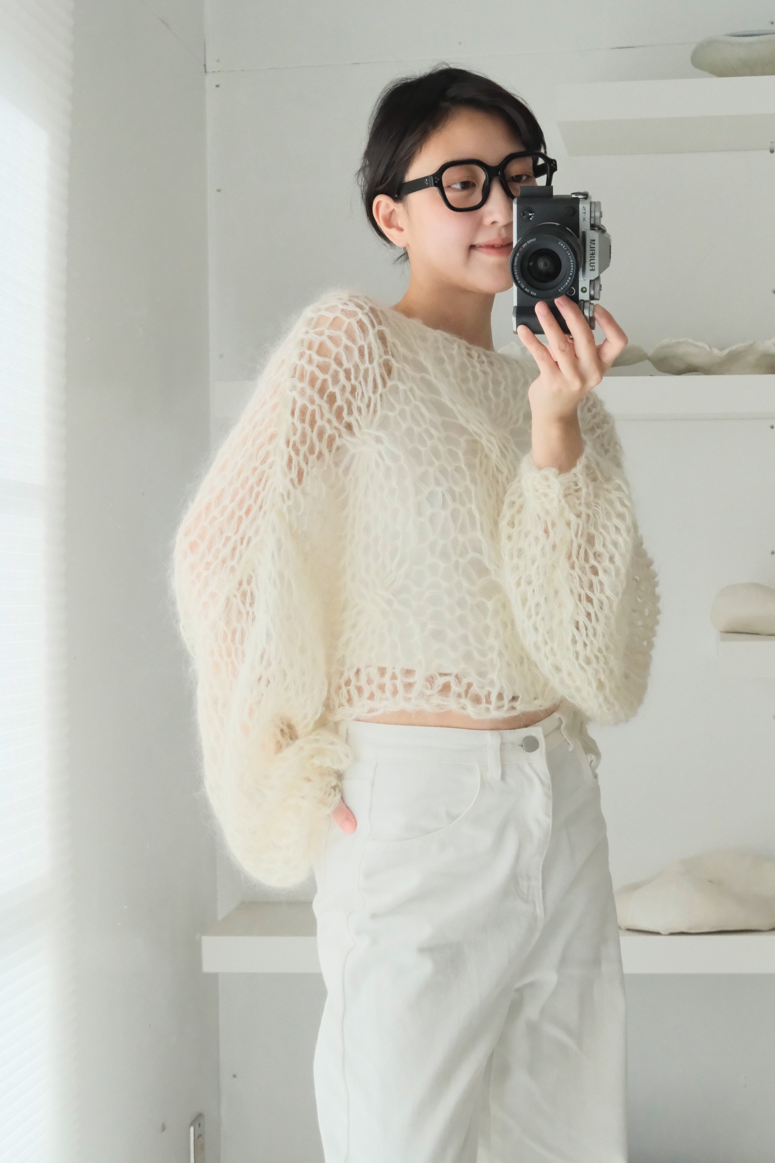 特にミックス毛糸でシースルーに仕上げている商品では、仕上げの際に糸端の処理をしていても着用中に糸端が表にでることがあります。質感の一部としてお楽しみ頂ける方のみご購入ください。
