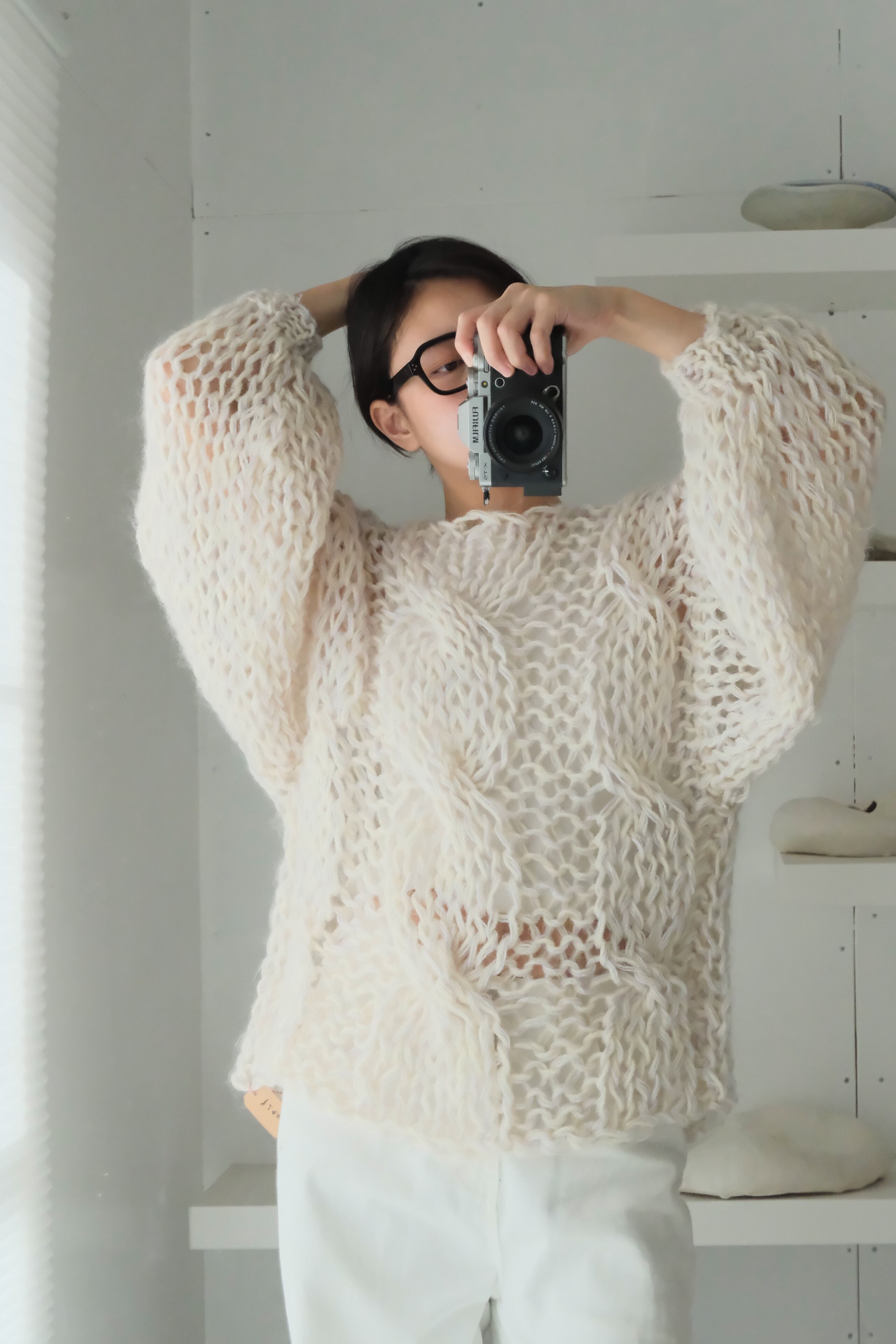 特にミックス毛糸でシースルーに仕上げている商品では、仕上げの際に糸端の処理をしていても着用中に糸端が表にでることがあります。質感の一部としてお楽しみ頂ける方のみご購入ください。