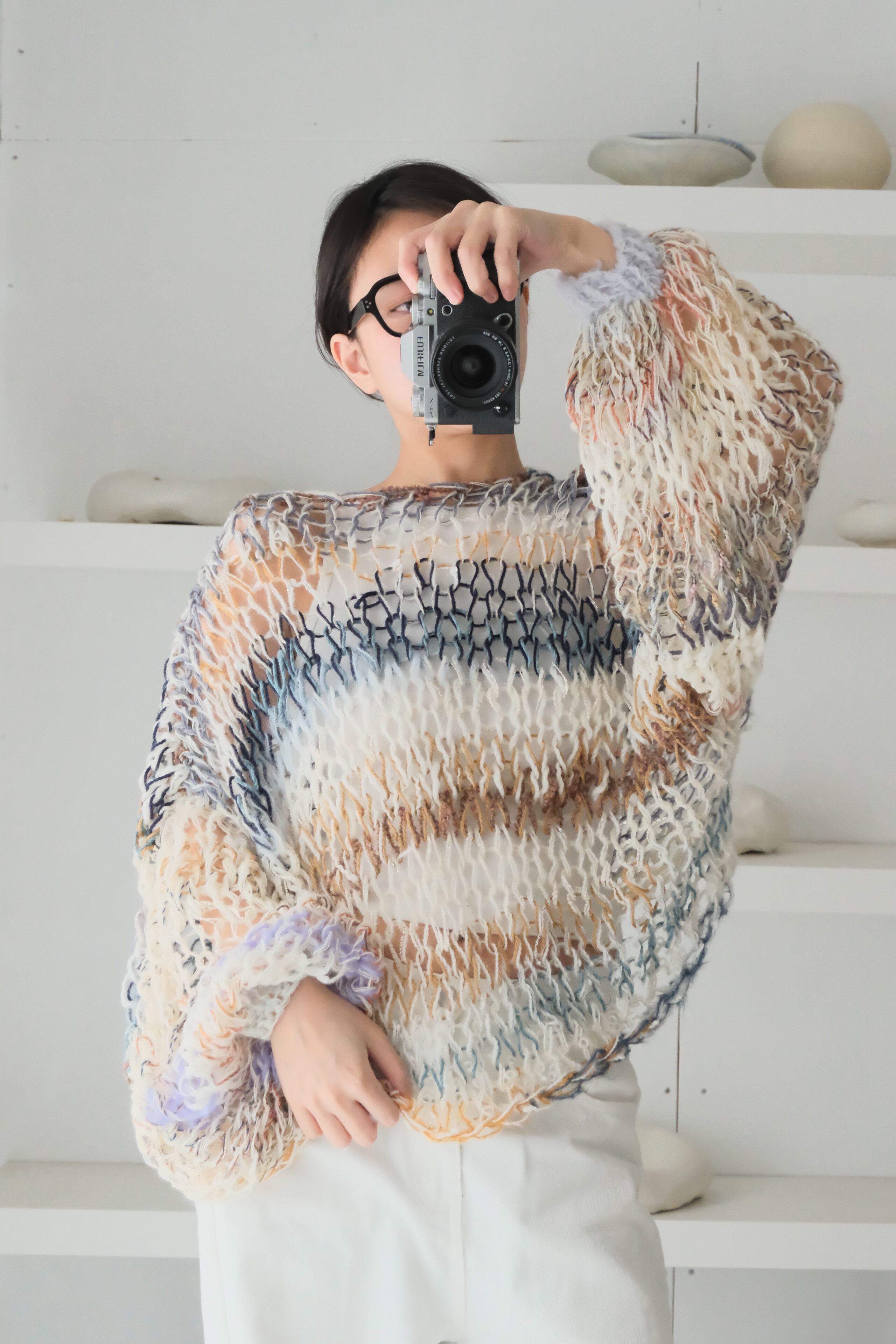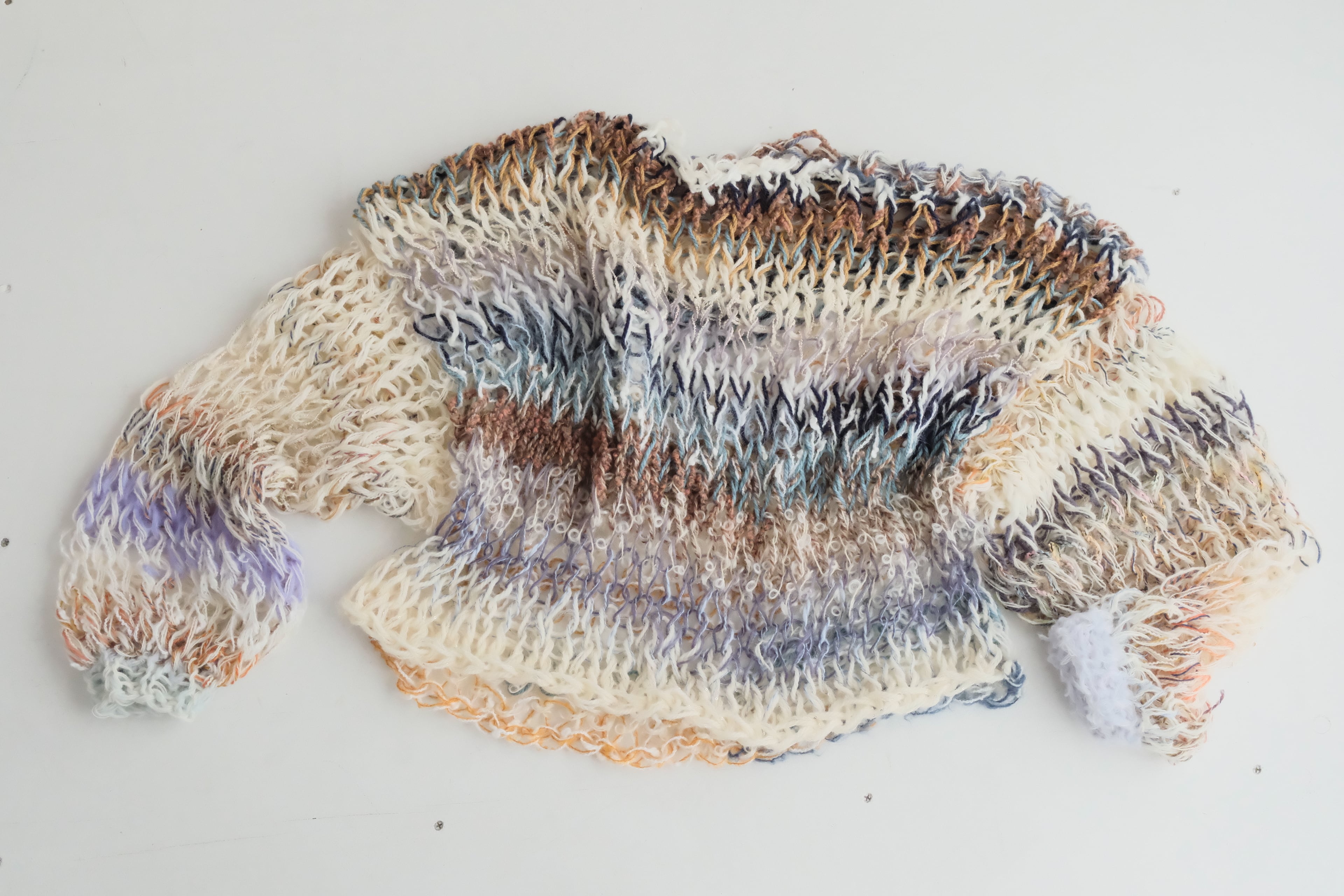 質感の異なる毛糸を数十種類ミックスしたシースルーセーター