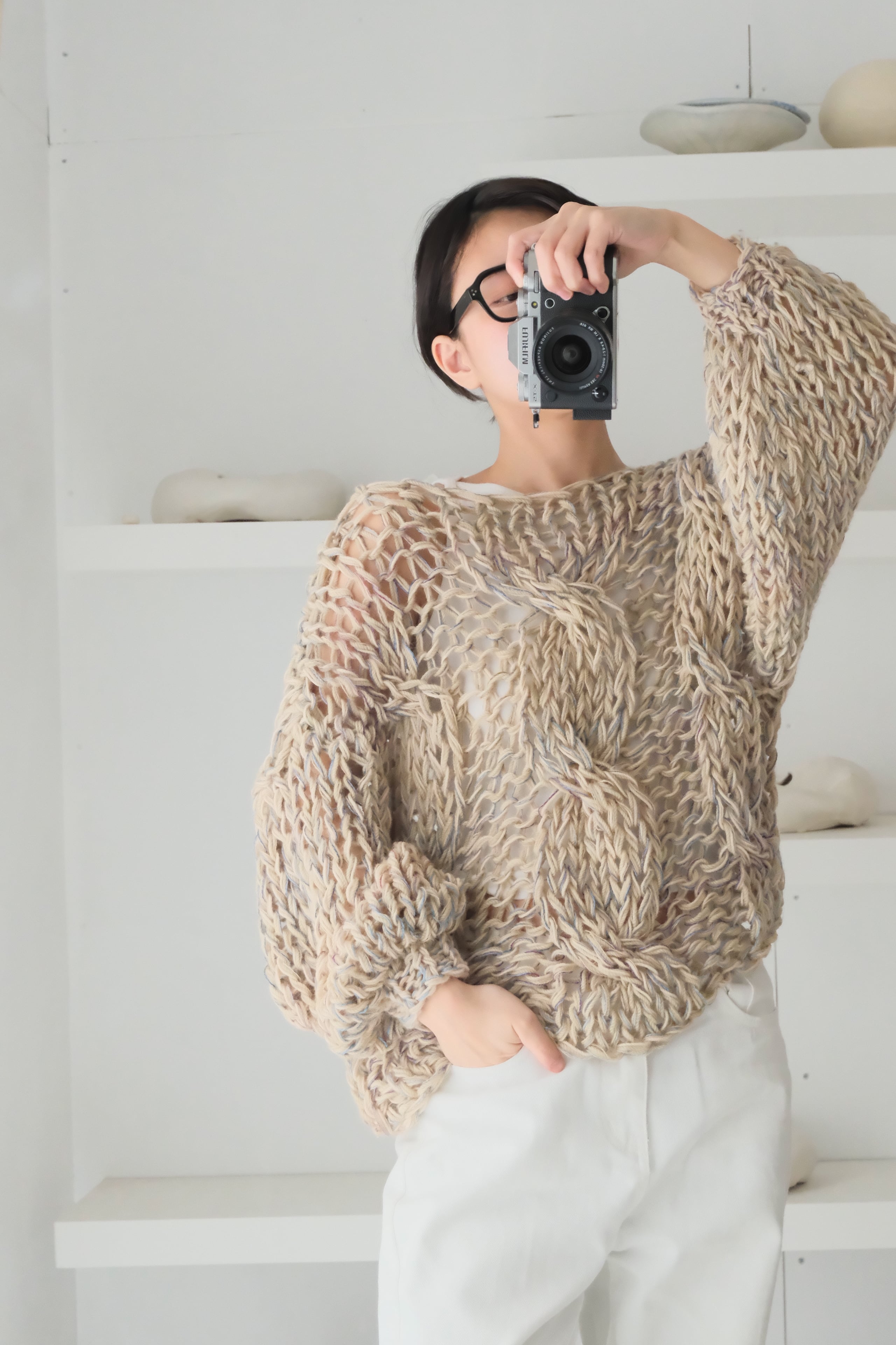 特にミックス毛糸でシースルーに仕上げている商品では、仕上げの際に糸端の処理をしていても着用中に糸端が表にでることがあります。質感の一部としてお楽しみ頂ける方のみご購入ください。