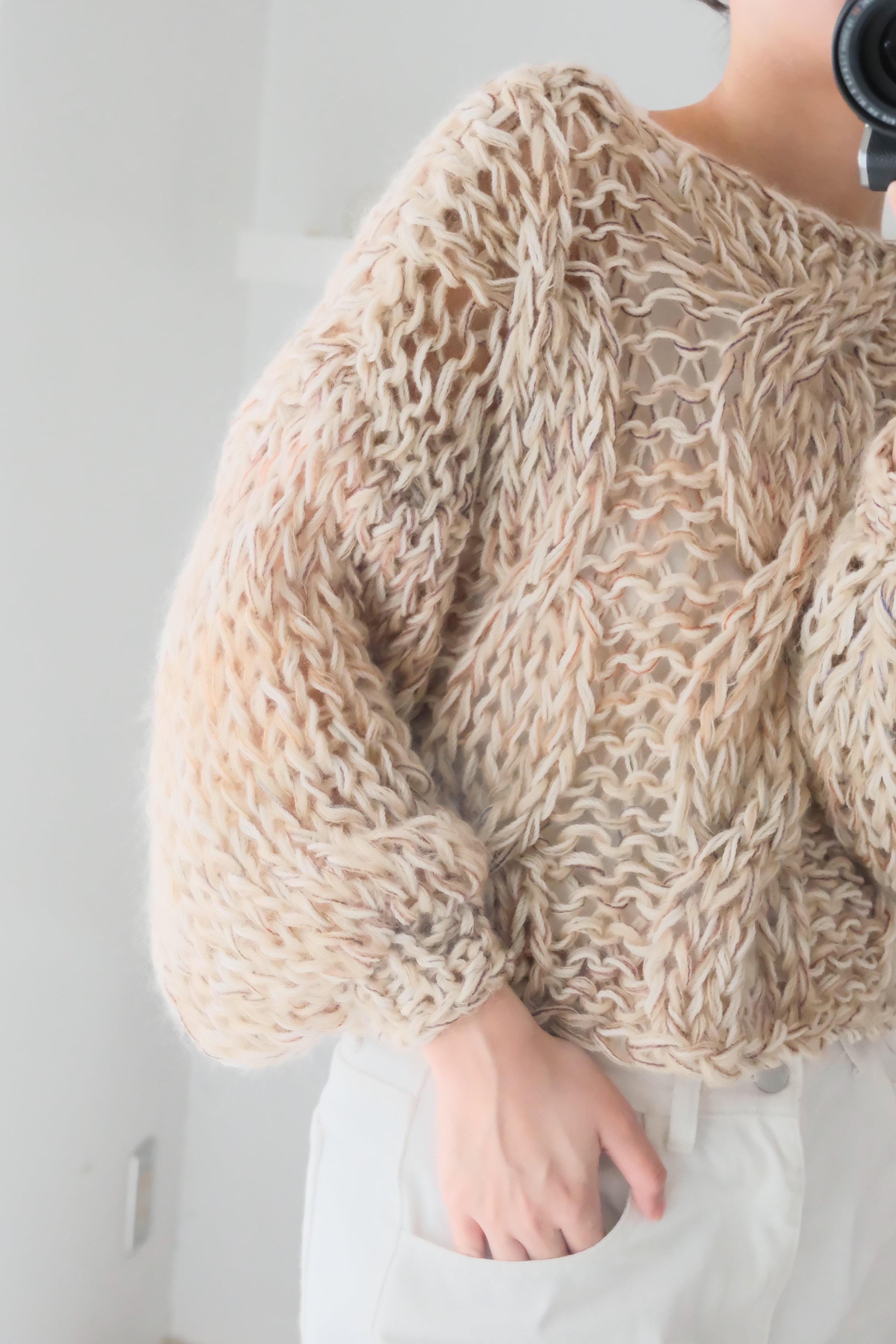 特にミックス毛糸でシースルーに仕上げている商品では、仕上げの際に糸端の処理をしていても着用中に糸端が表にでることがあります。質感の一部としてお楽しみ頂ける方のみご購入ください。
