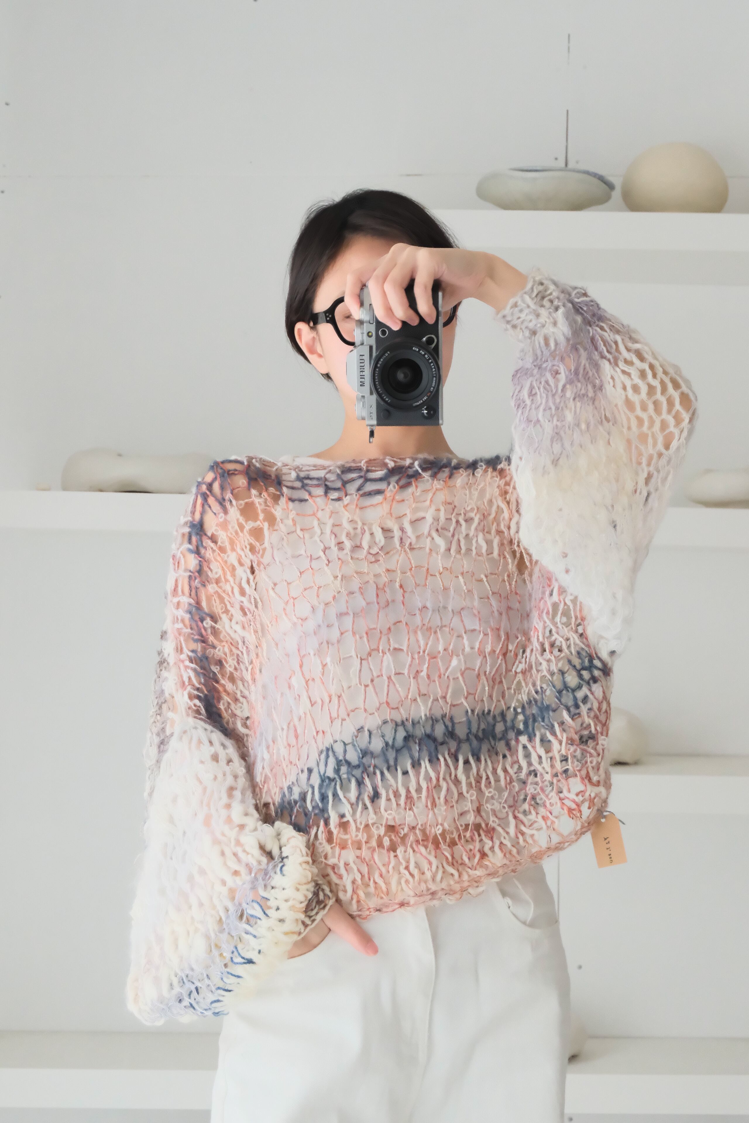特にミックス毛糸でシースルーに仕上げている商品では、仕上げの際に糸端の処理をしていても着用中に糸端が表にでることがあります。質感の一部としてお楽しみ頂ける方のみご購入ください。