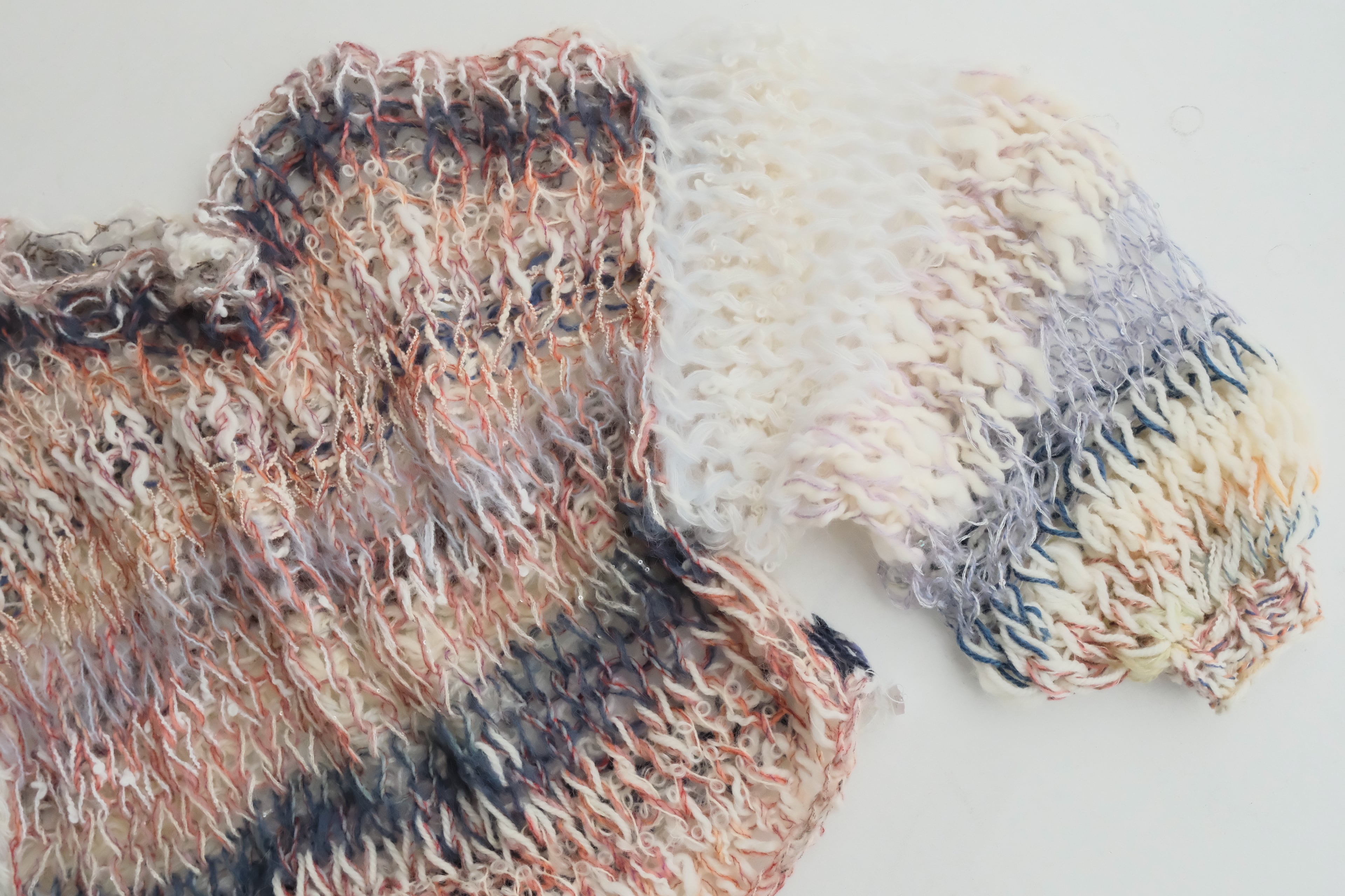 •セカンドハンドの毛糸を混ぜて使用しているため正確な品質表示が出せませんが、主に60~100%モヘア/ウール、その他アンゴラ、綿、シルク、アクリル、ポリエステルなどです。