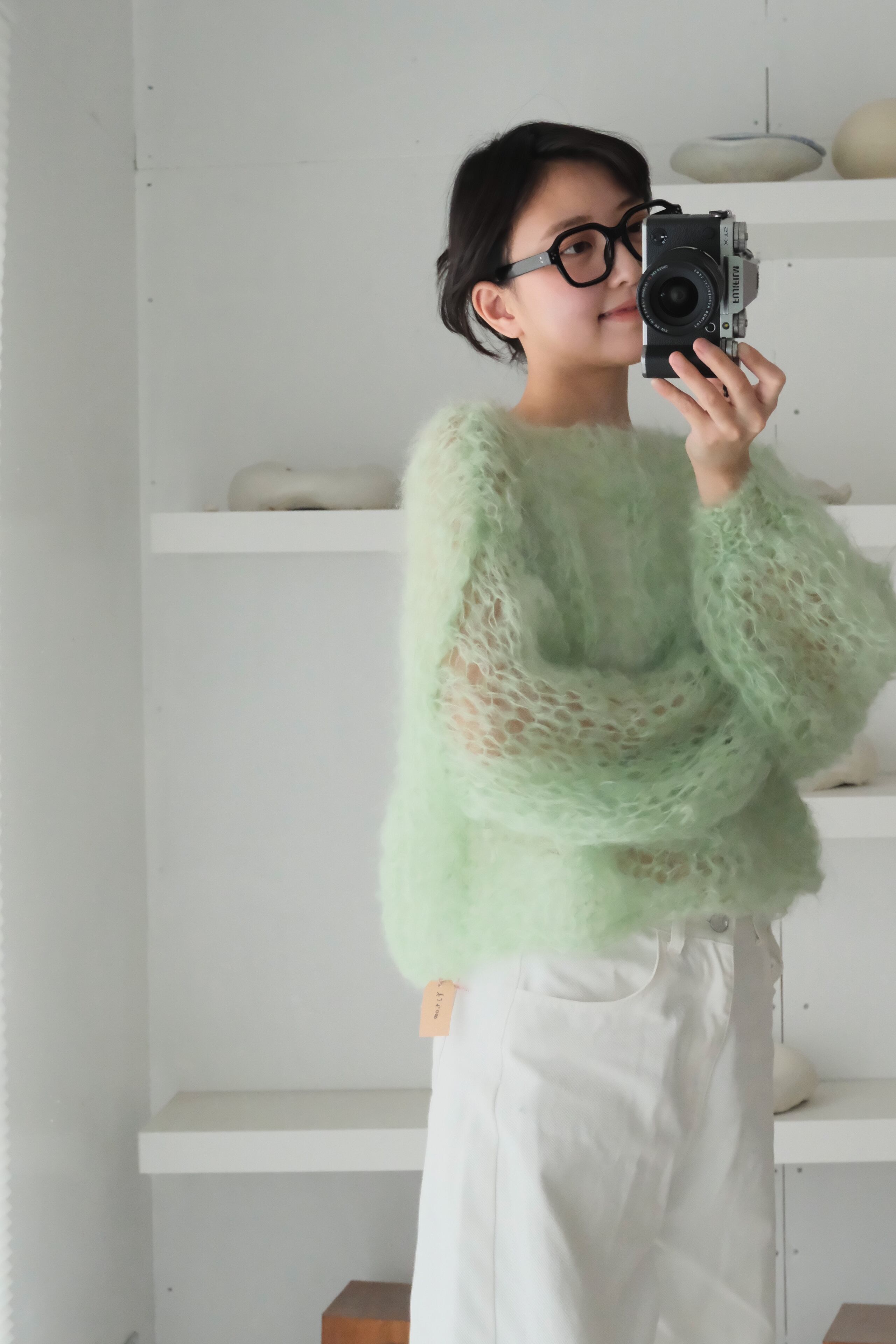 ・amuamuのセーターのほとんどにモヘア毛糸を使用していますが、モヘアの毛糸は柔らかな風合いを活かすため糸の撚りが弱く、毛落ちが発生します。毛糸の性質によるもので、商品不良ではありません。
