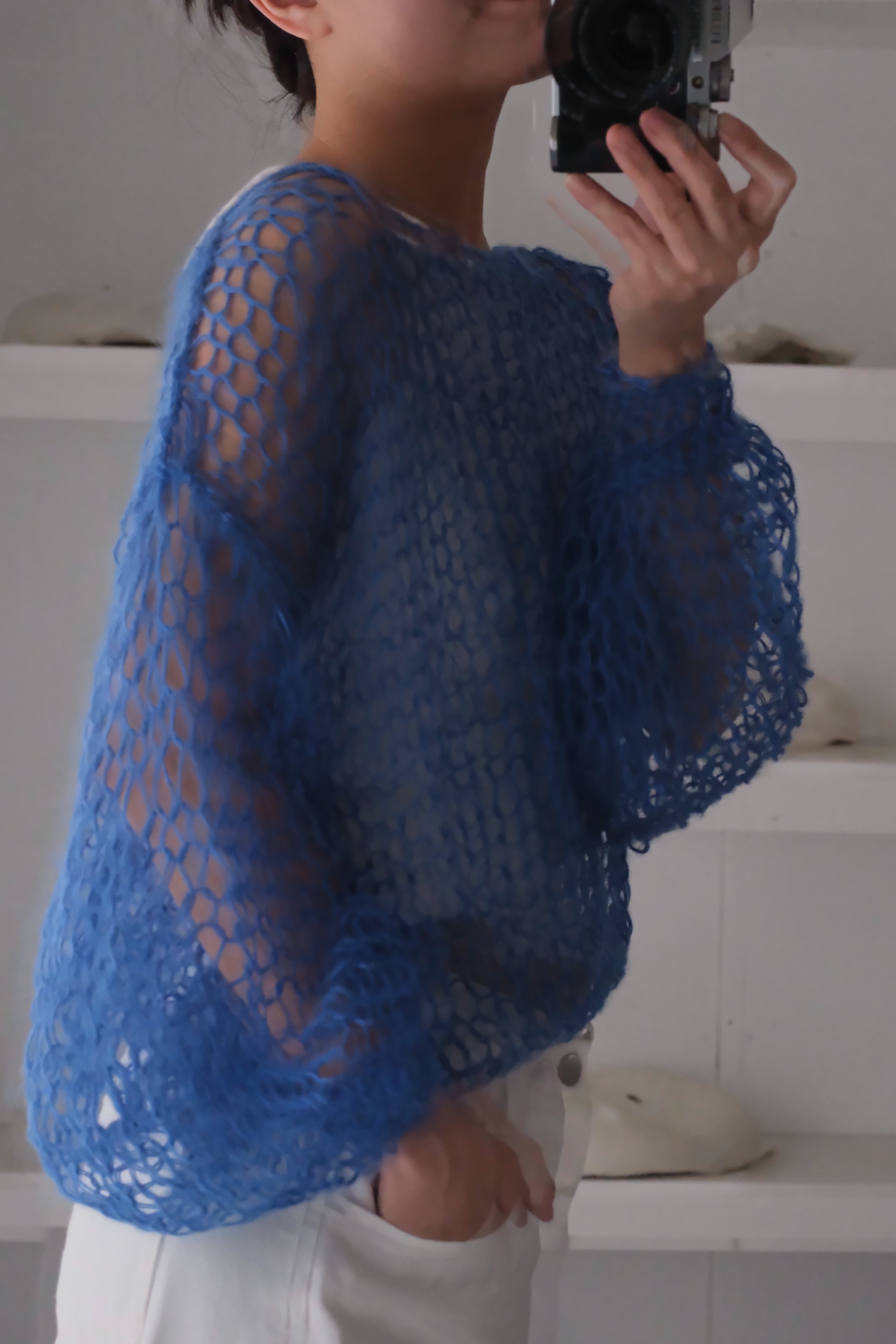 An airy, cosy layer of comfort that hugs your skin — every single piece is uniquely handknitted, using plenty of high quality second hand wool and mohair yarns.