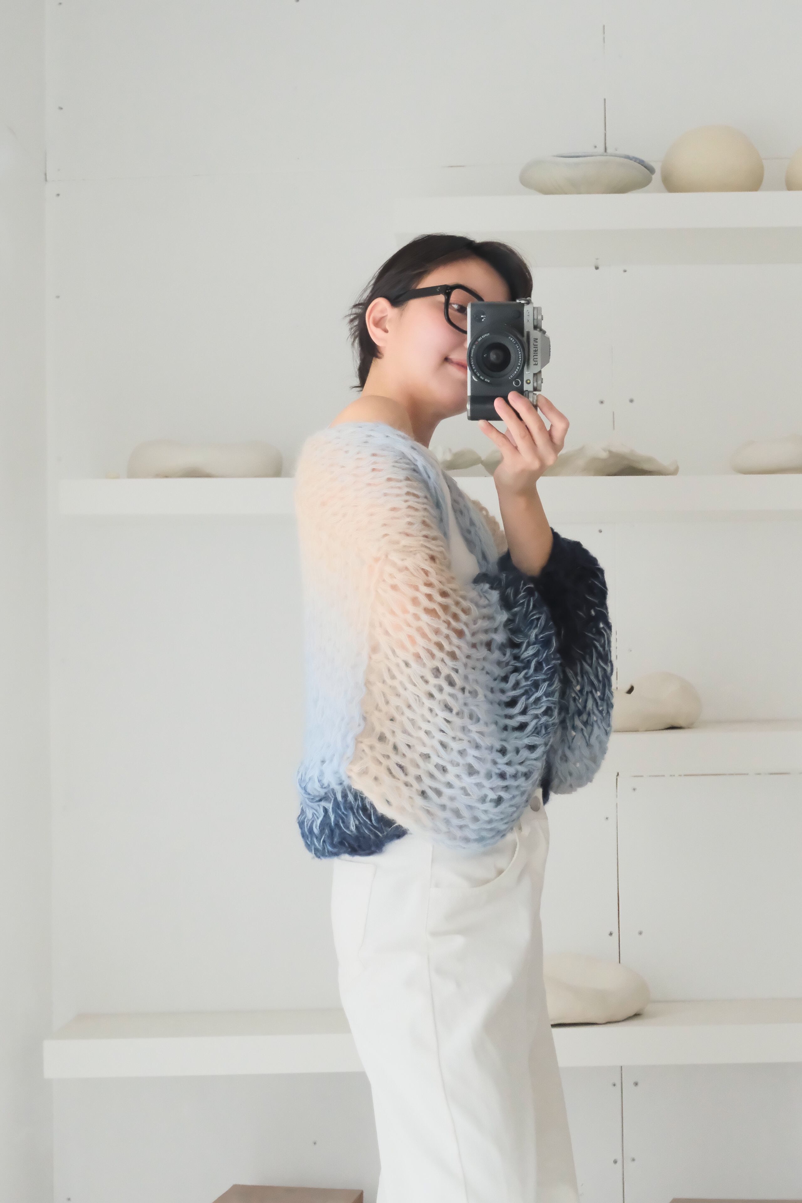 特にミックス毛糸でシースルーに仕上げている商品では、仕上げの際に糸端の処理をしていても着用中に糸端が表にでることがあります。質感の一部としてお楽しみ頂ける方のみご購入ください。