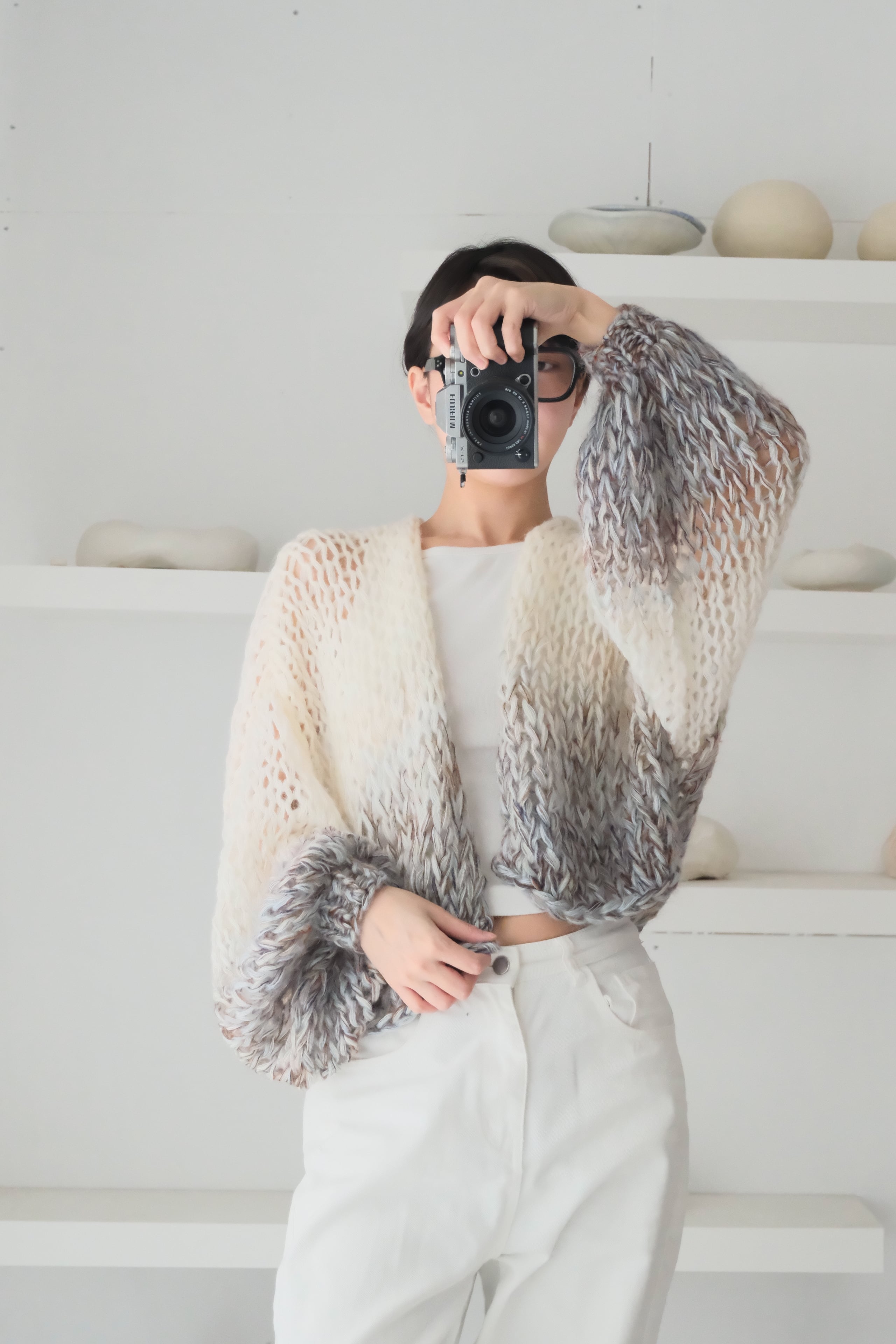 特にミックス毛糸でシースルーに仕上げている商品では、仕上げの際に糸端の処理をしていても着用中に糸端が表にでることがあります。質感の一部としてお楽しみ頂ける方のみご購入ください。