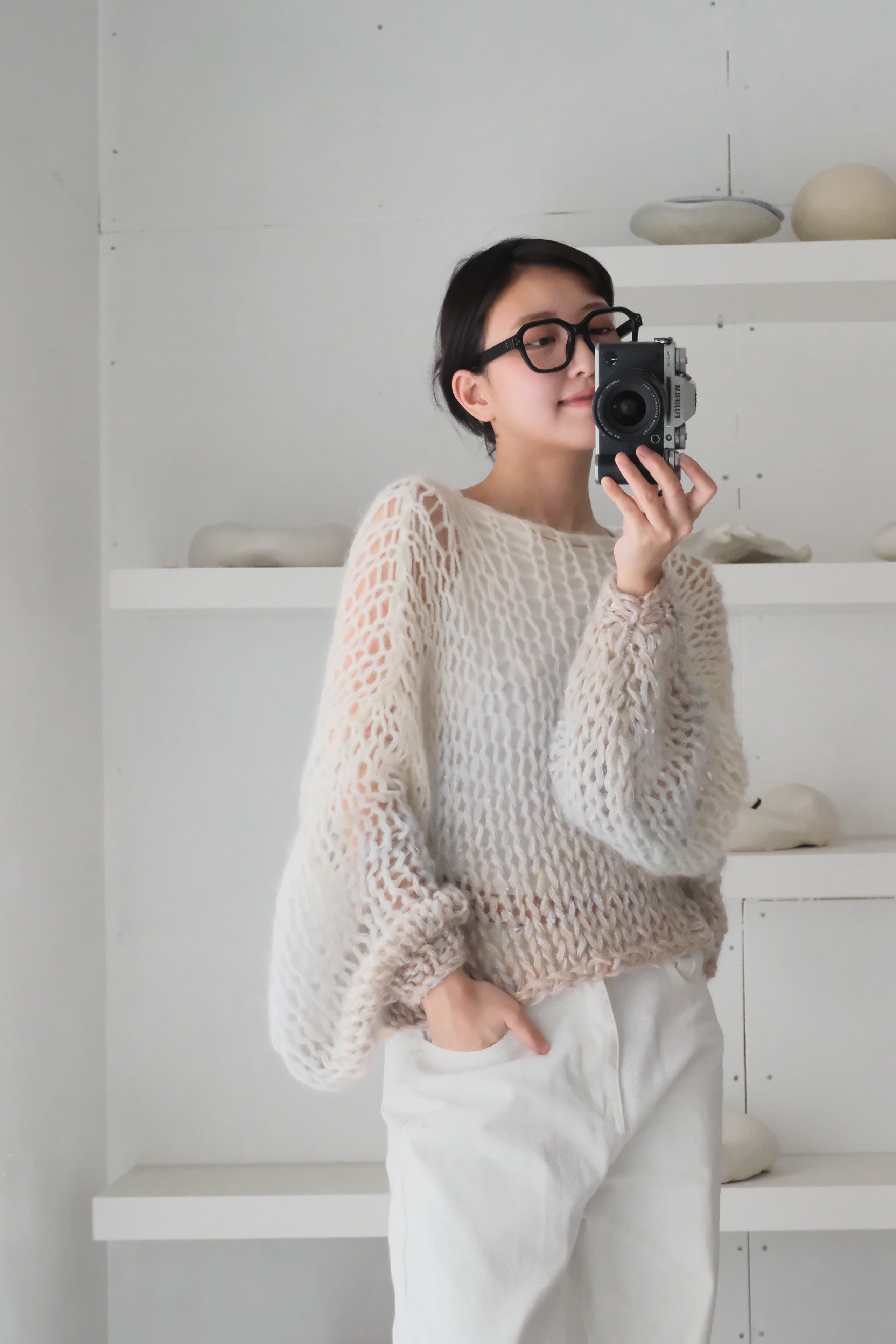 特にミックス毛糸でシースルーに仕上げている商品では、仕上げの際に糸端の処理をしていても着用中に糸端が表にでることがあります。質感の一部としてお楽しみ頂ける方のみご購入ください。