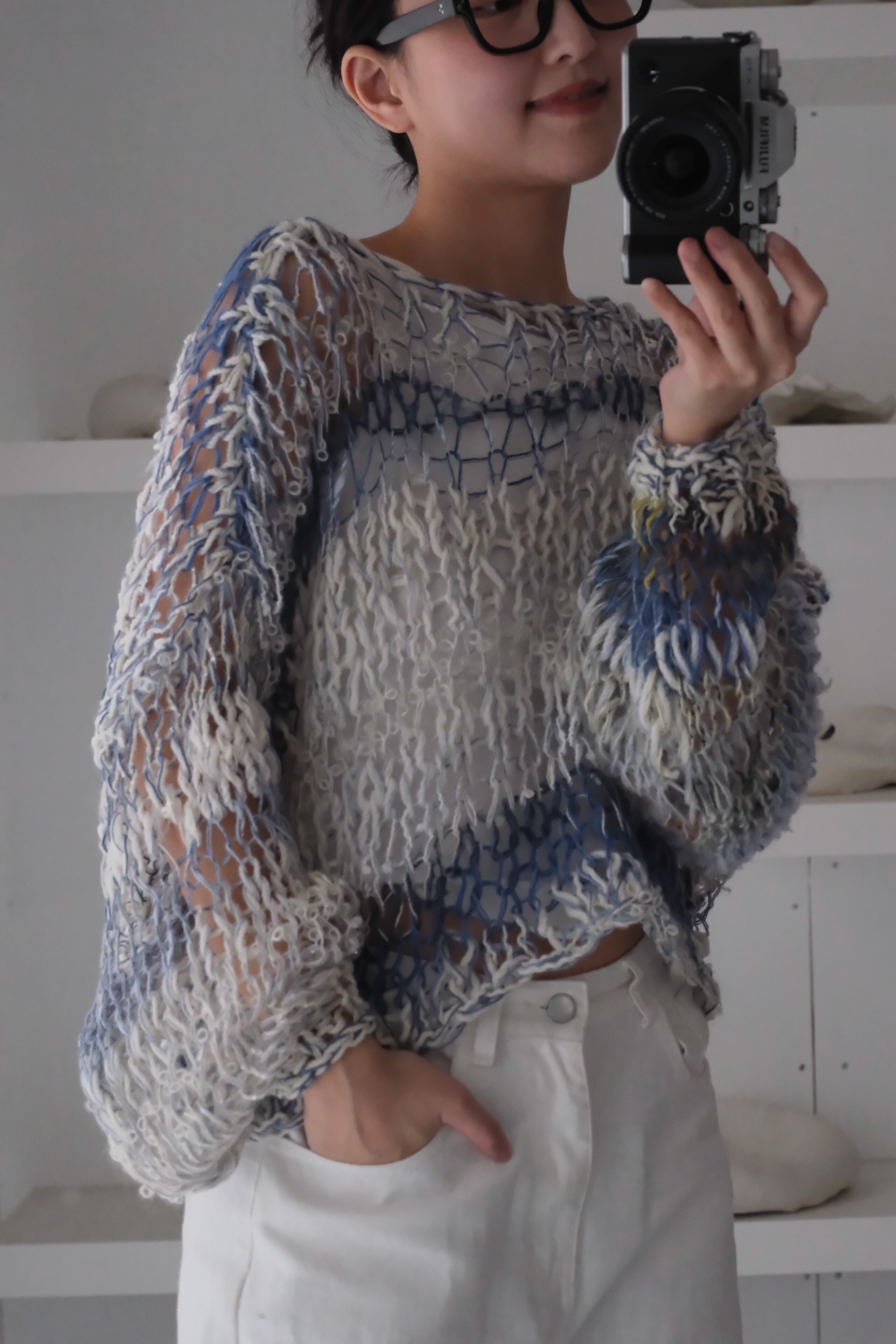 質感の異なる毛糸を数十種類ミックスしたシースルーセーター