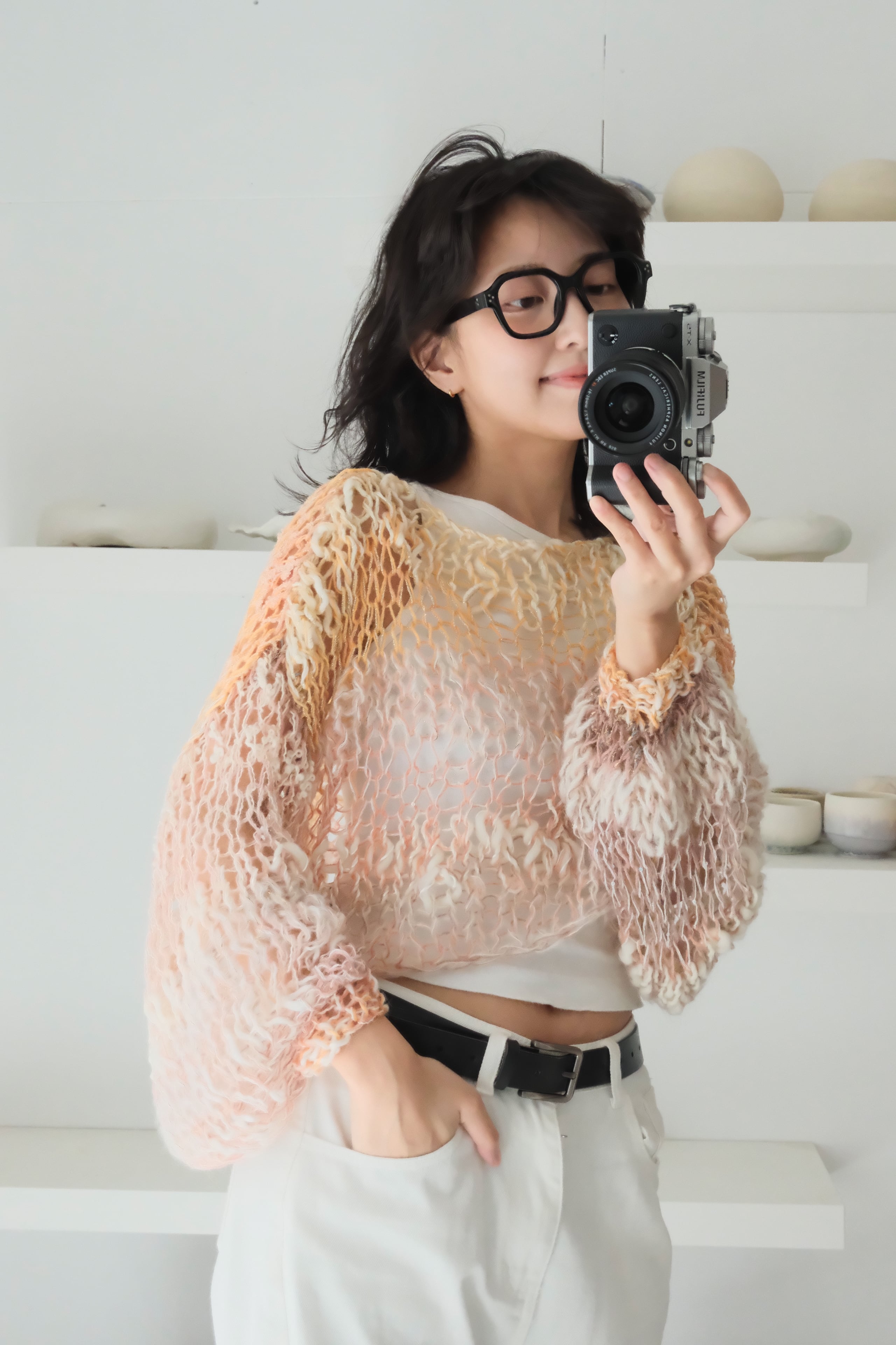 特にミックス毛糸でシースルーに仕上げている商品では、仕上げの際に糸端の処理をしていても着用中に糸端が表にでることがあります。質感の一部としてお楽しみ頂ける方のみご購入ください。
