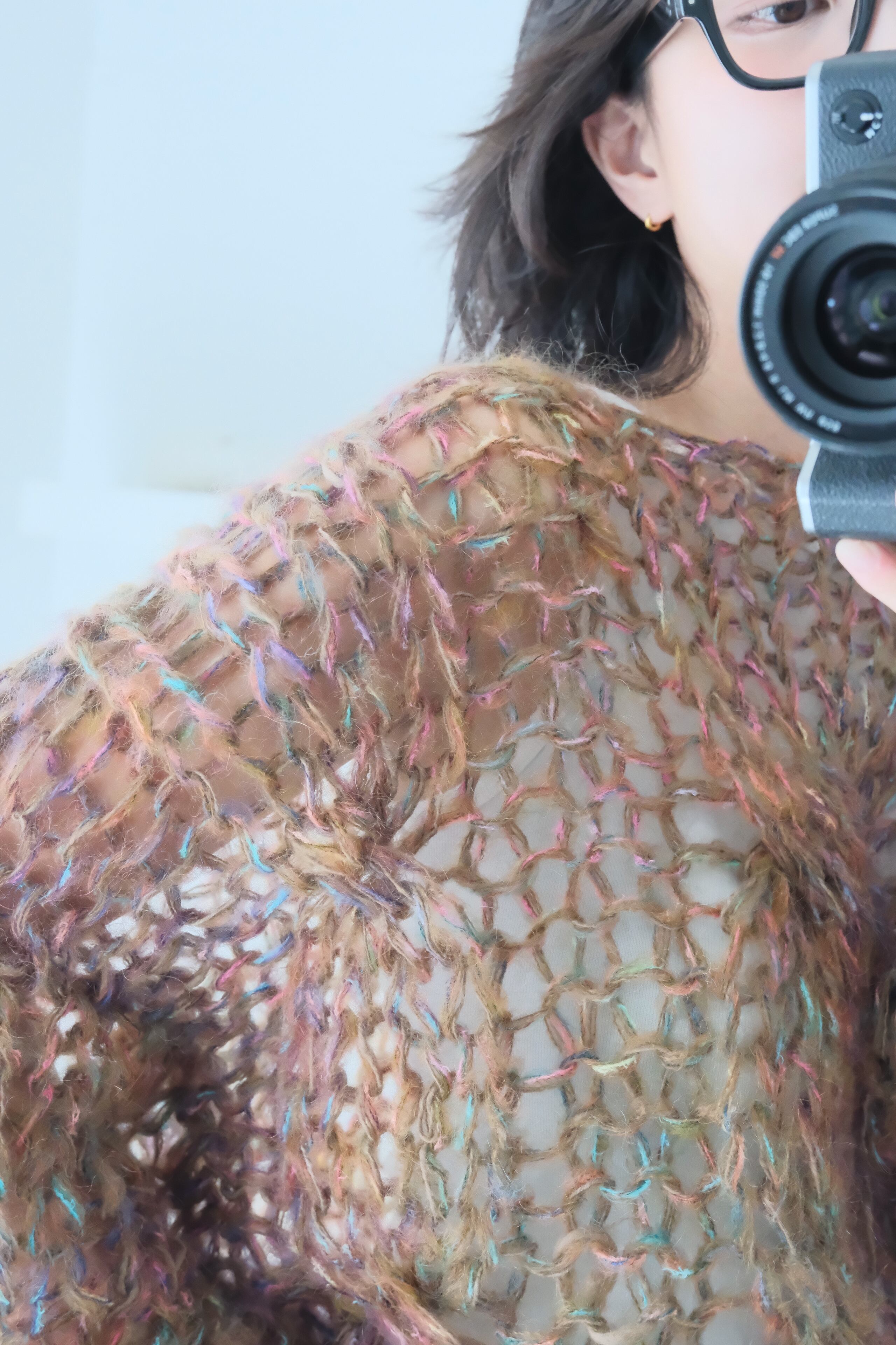 キャンディーカラーがミックスされた柔らかなブラウンのモヘアを軽やかに編み上げたシースルーセーター