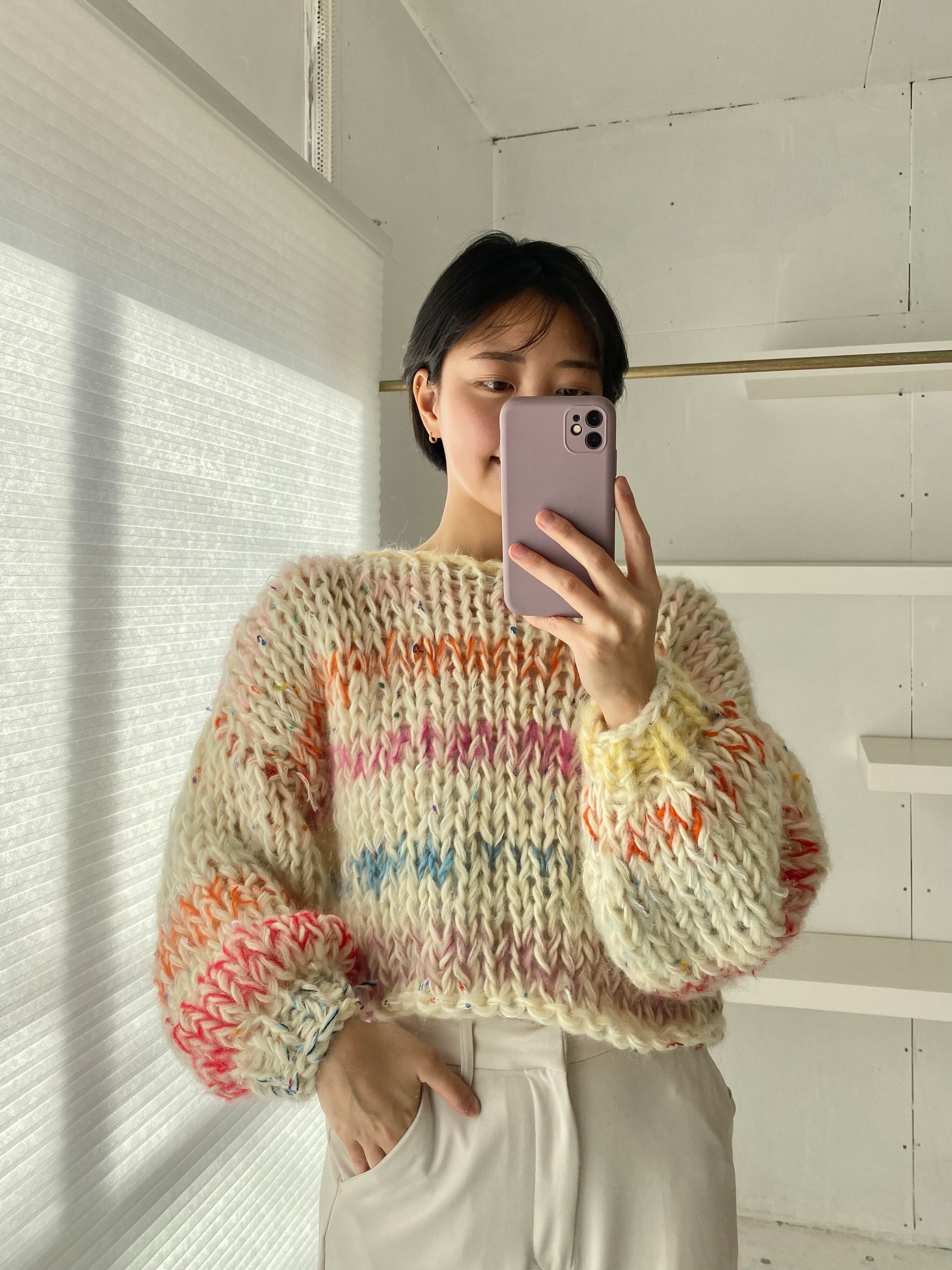 一期一会のセカンドハンド毛糸を使用した、全て一点物の手編みセーター。
