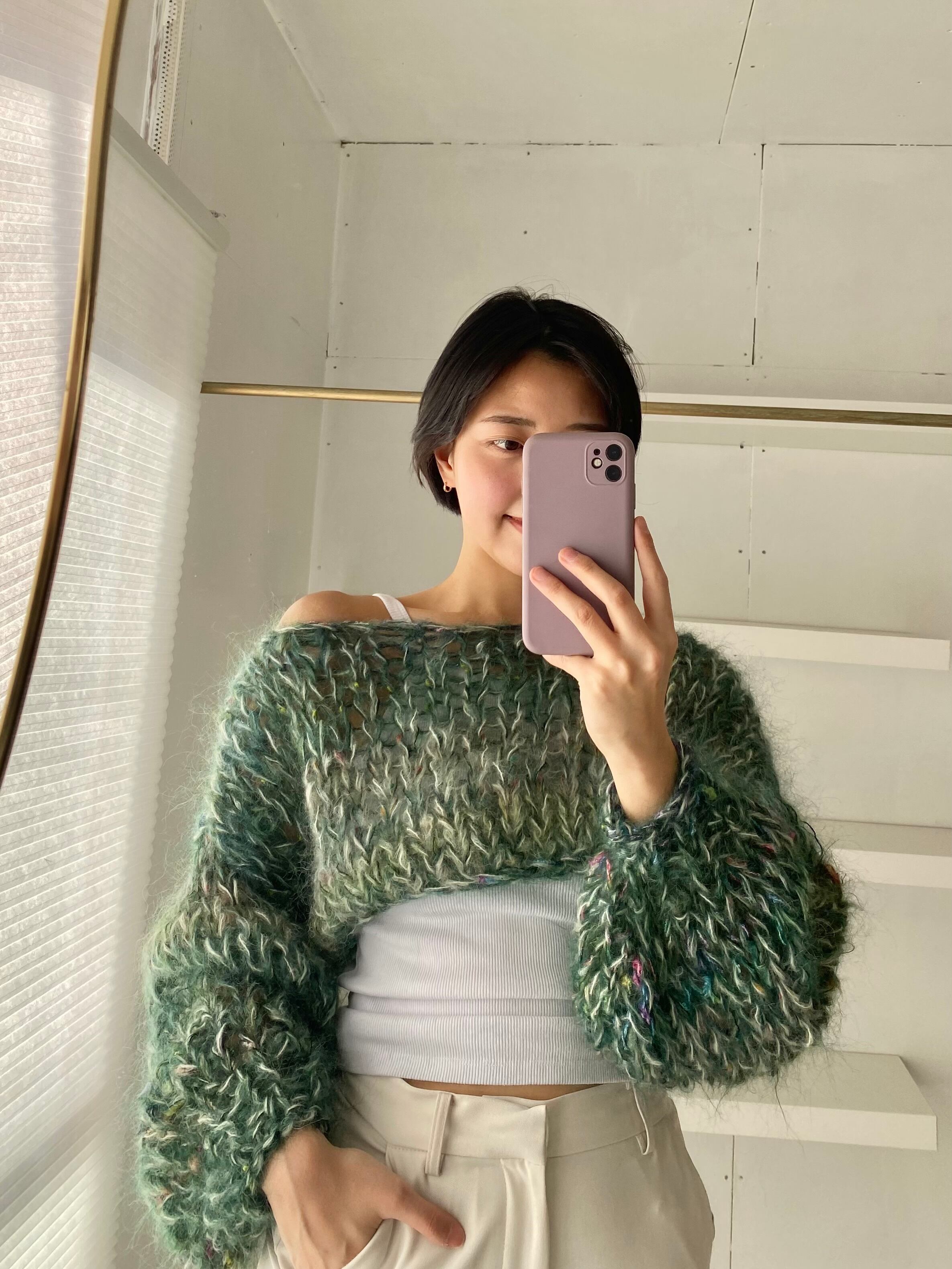 いろいろな毛糸をミックスした、ショート丈のセーター