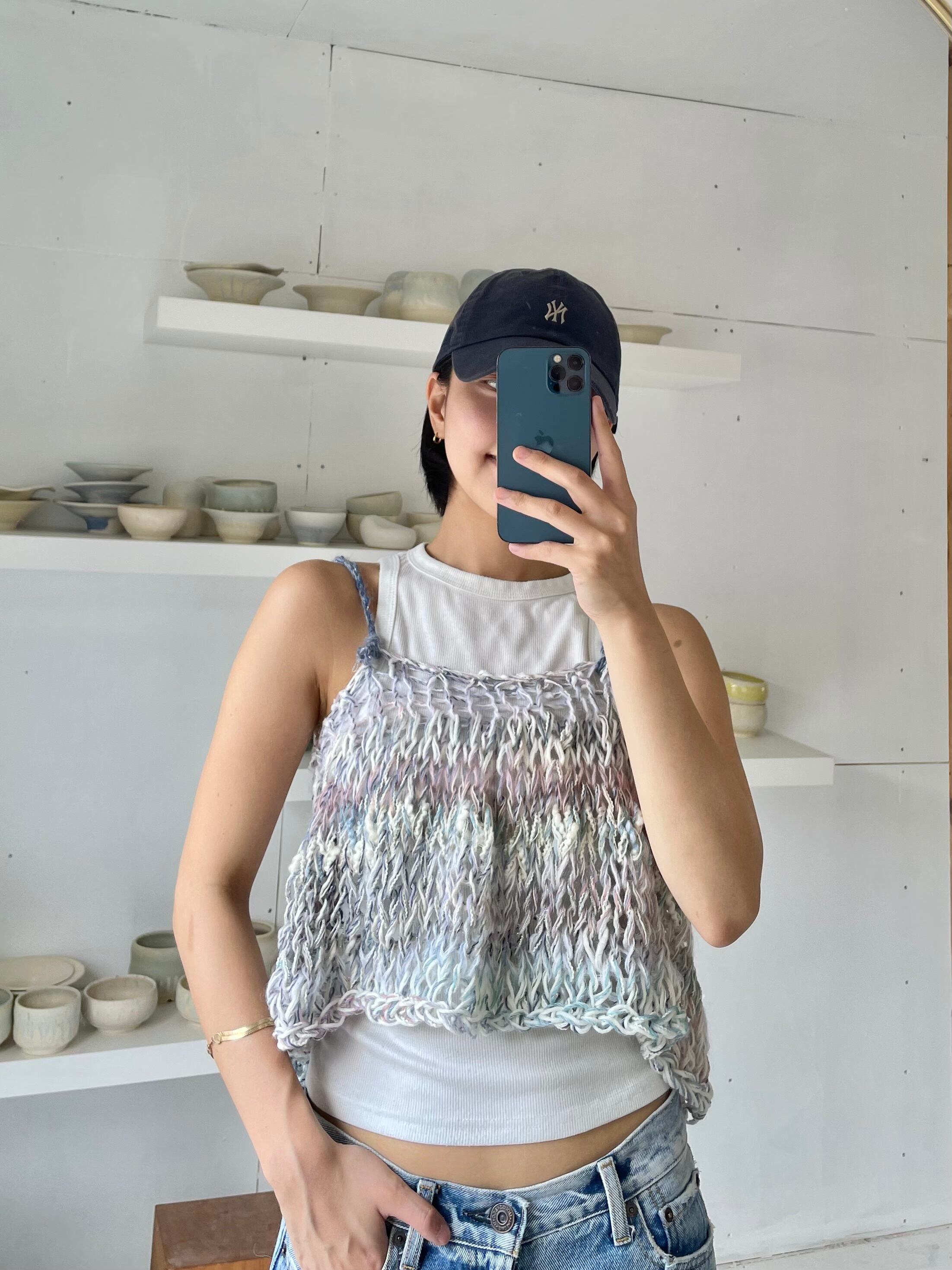特にミックス毛糸でシースルーに仕上げている商品では、仕上げの際に糸端の処理をしていても着用中に糸端が表にでることがあります。質感の一部としてお楽しみ頂ける方のみご購入ください。
