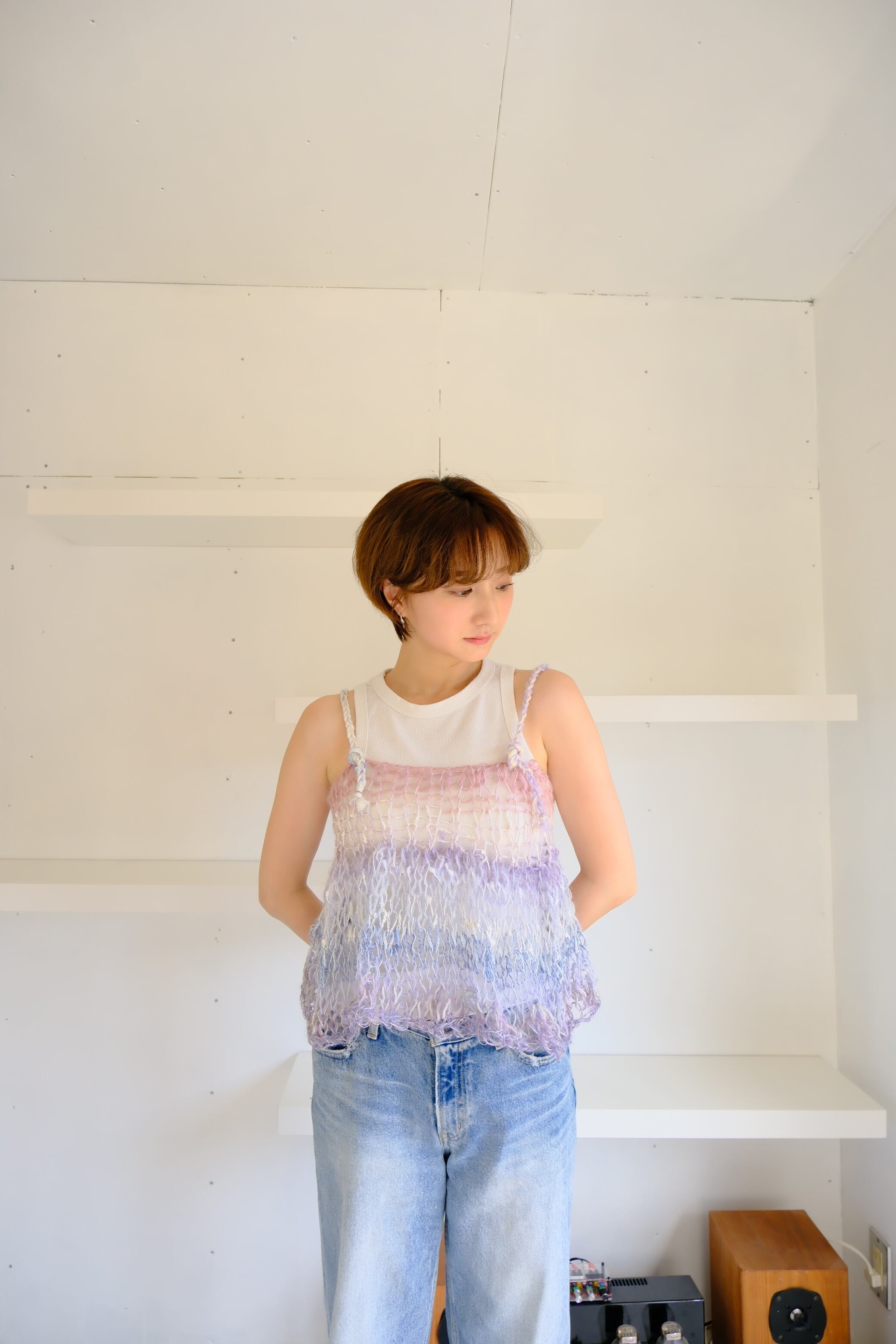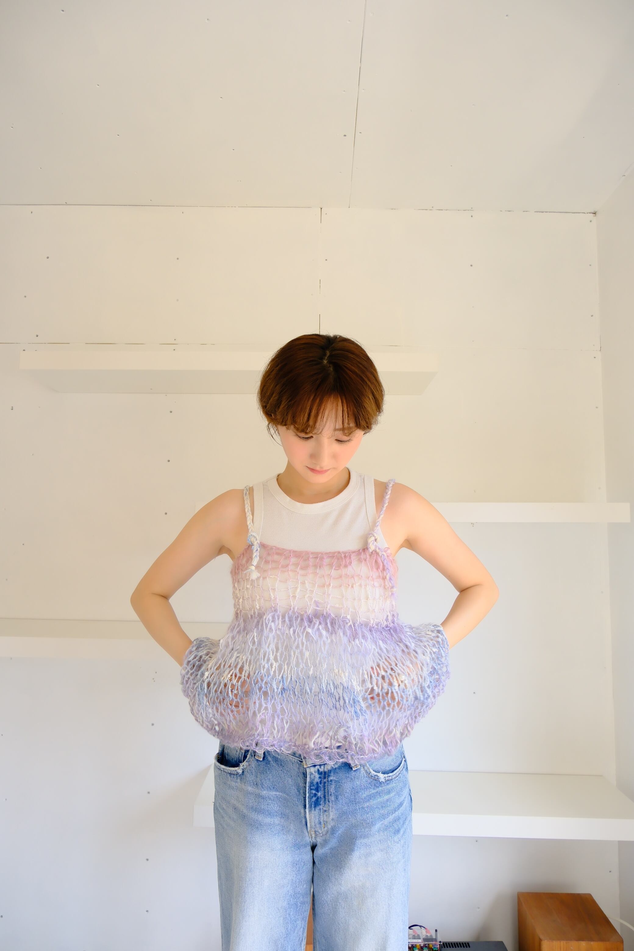 特にミックス毛糸でシースルーに仕上げている商品では、仕上げの際に糸端の処理をしていても着用中に糸端が表にでることがあります。質感の一部としてお楽しみ頂ける方のみご購入ください。