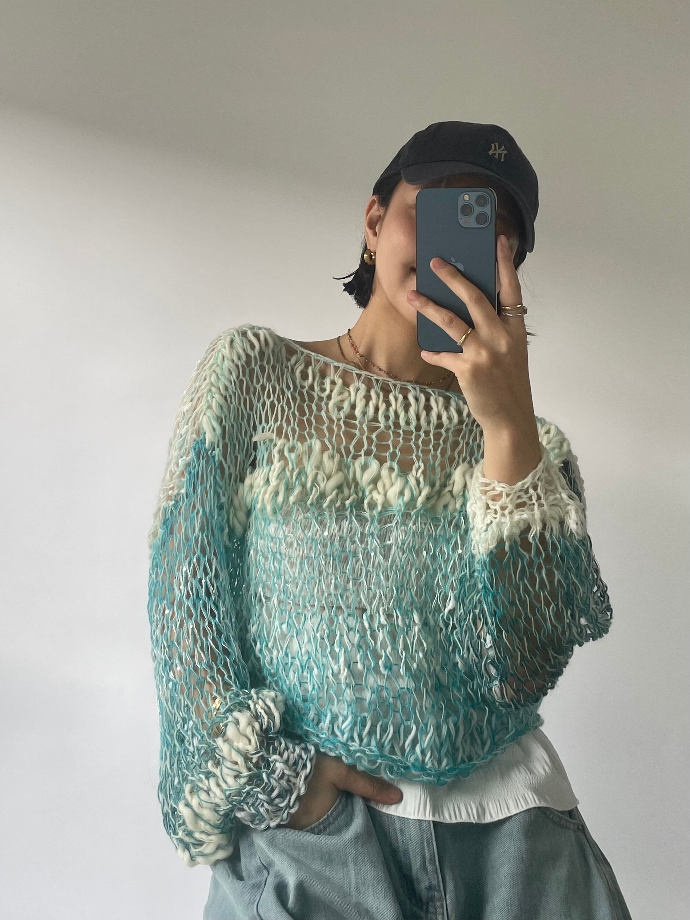 •糸を引き揃えて制作しており、商品によっては糸端が表に出ることがありますが製法上の特性ですので商品不良での返品対象になりません。気になるようでしたら裏から引っ張ってしまうか、表に出ている部分を切ってください。特にミックス毛糸でシースルーに仕上げている商品では、仕上げの際に糸端の処理をしていても着用中に糸端が表にでることがあります。質感の一部としてお楽しみ頂ける方のみご購入ください。