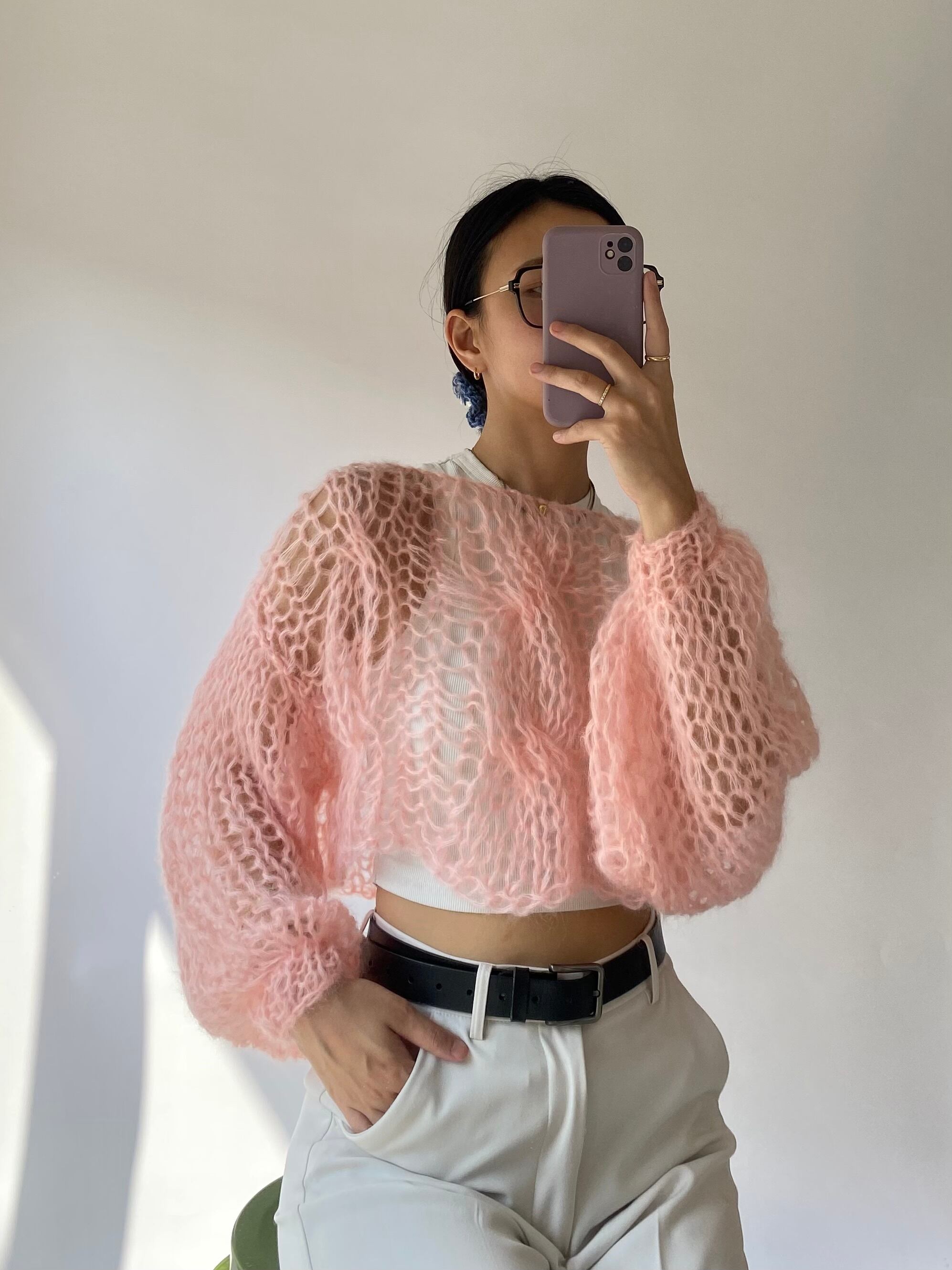 柔らかくて軽いモヘアを使用した、ショート丈のシースルーケーブルセーター