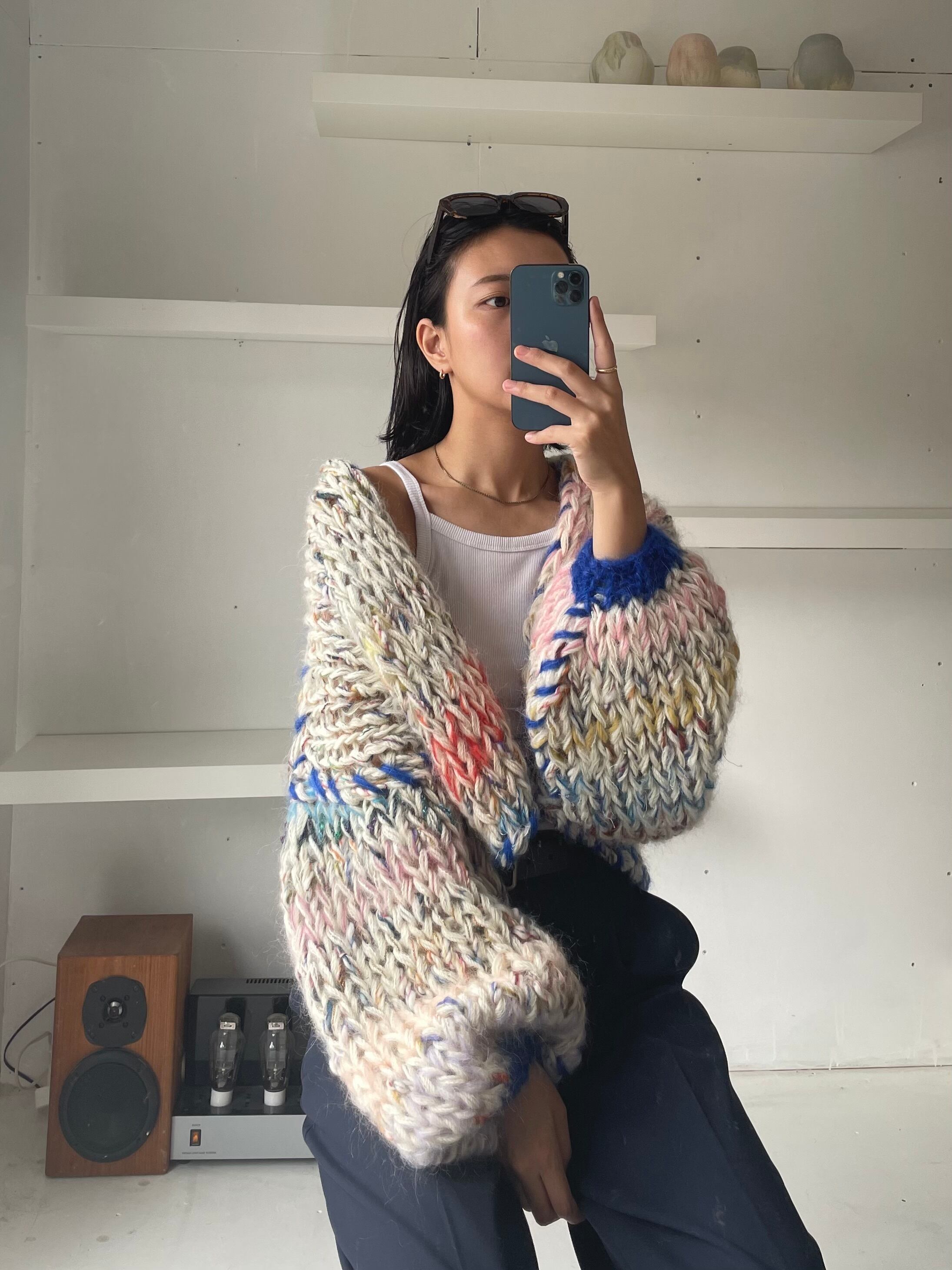 色々な毛糸をミックスした、柔らかいモヘアのステッチカーディガン