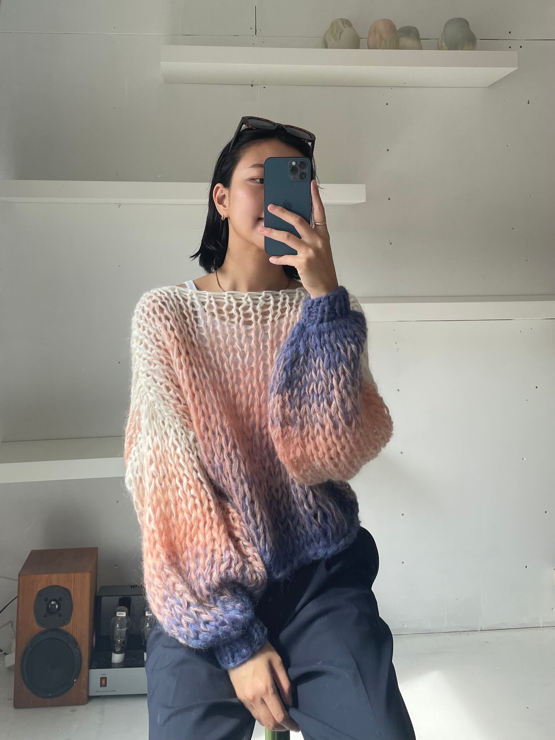 An airy, cosy layer of comfort that hugs your skin — every single piece is uniquely handknitted, using plenty of high quality second hand wool and mohair yarns.