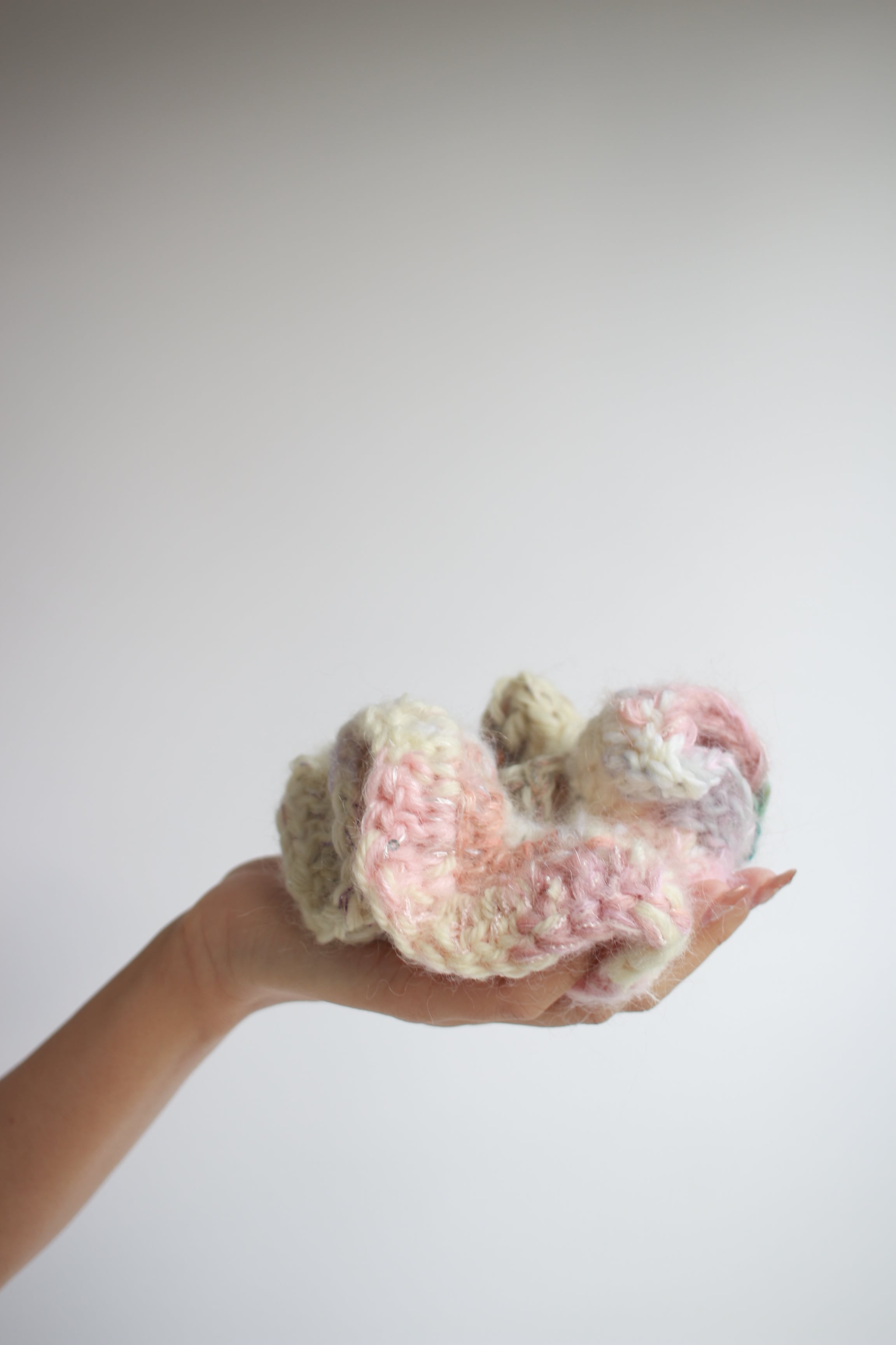 色々な毛糸をミックスした手編みのシュシュ