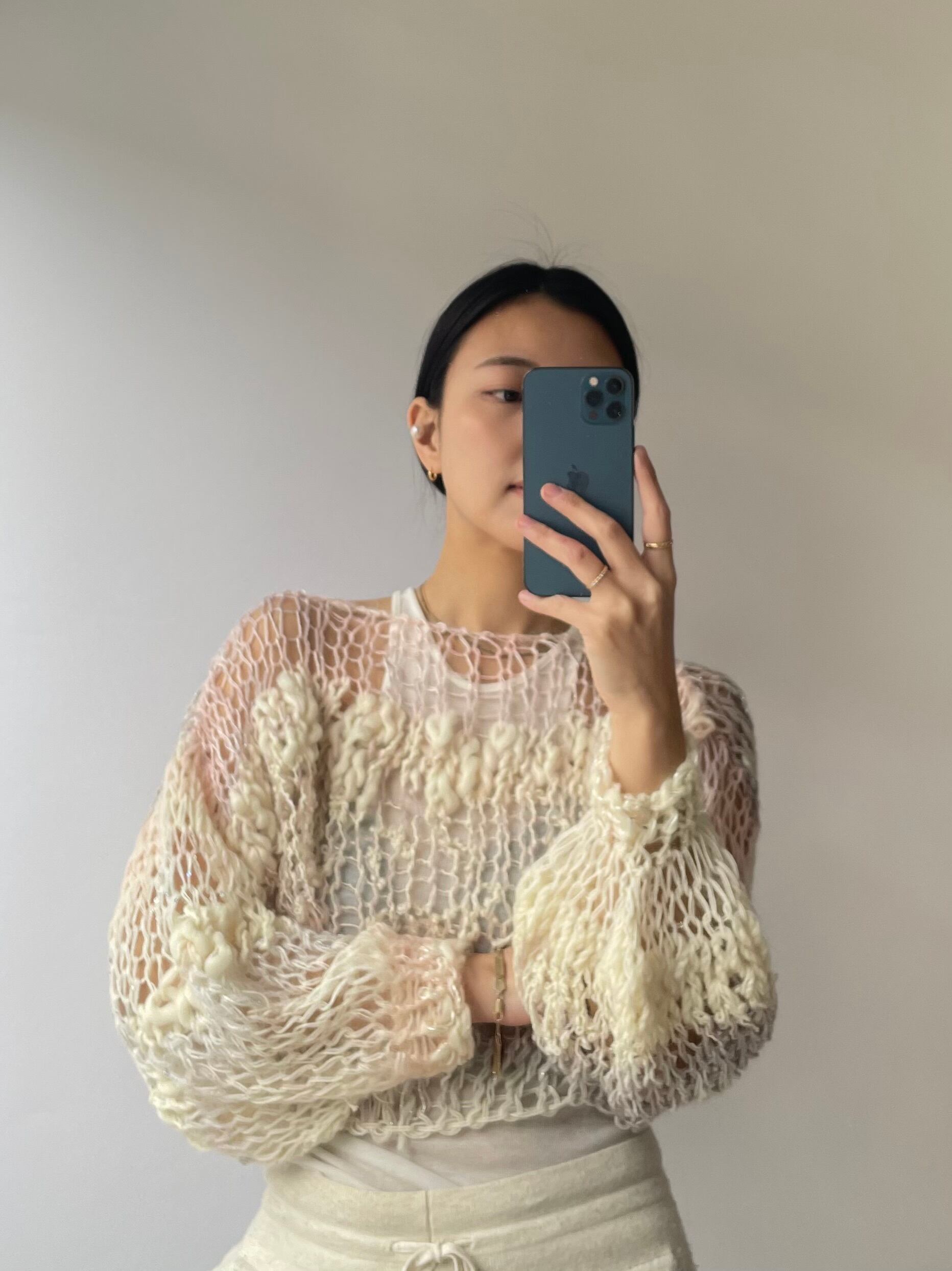 特にミックス毛糸でシースルーに仕上げている商品では、仕上げの際に糸端の処理をしていても着用中に糸端が表にでることがあります。質感の一部としてお楽しみ頂ける方のみご購入ください。